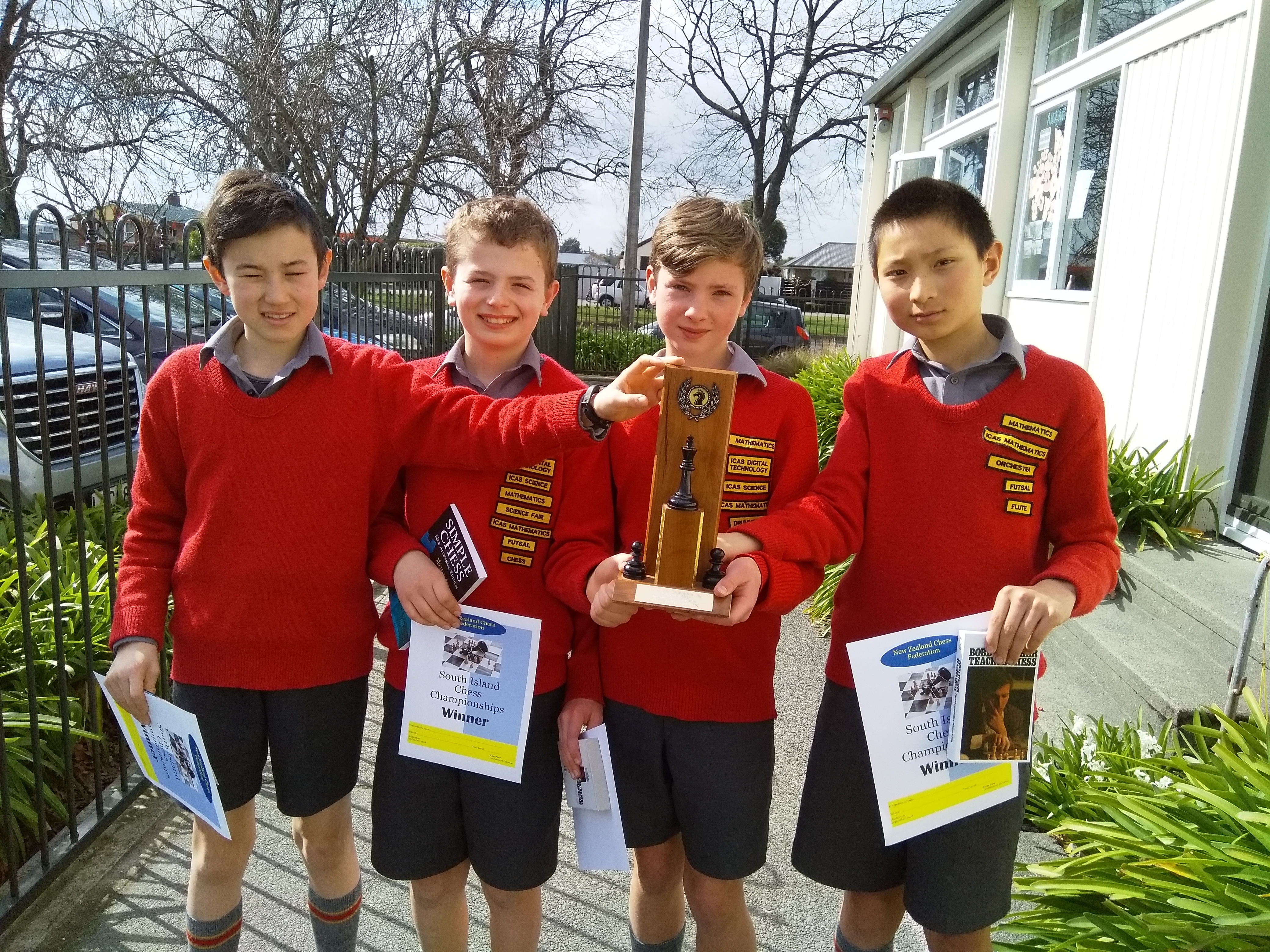 Congratulations to Alexander, Sam, Oliver and Harrison who won the South Island Chess Championships over the weekend. They have now qualified for the Nationals. Well done boys.