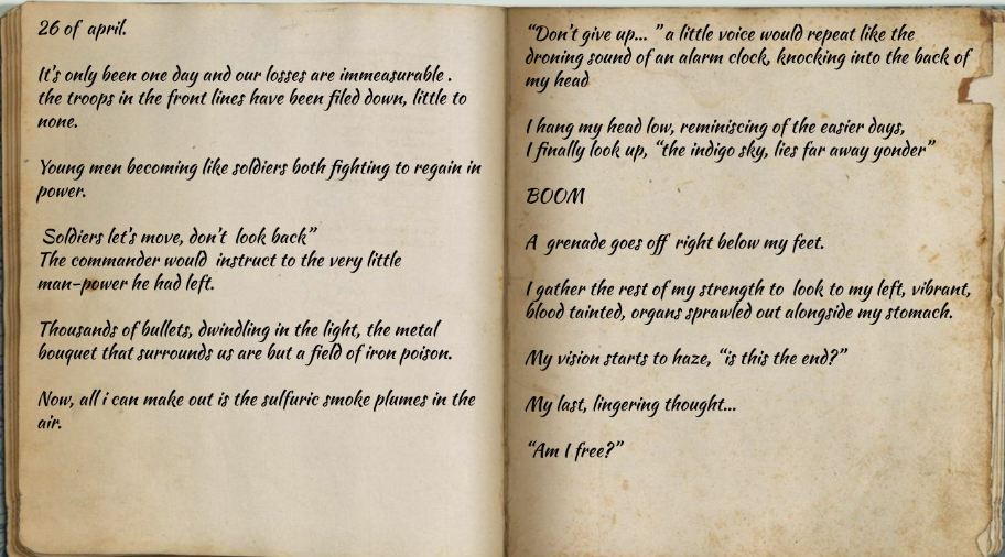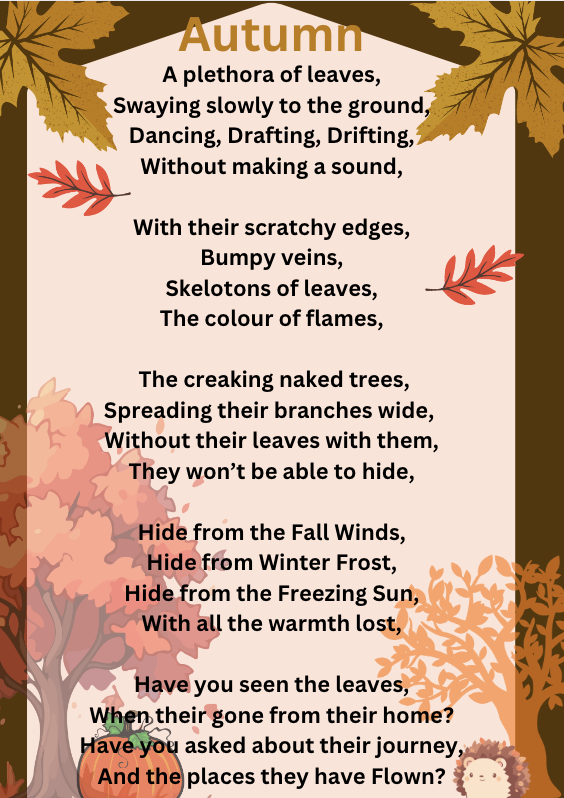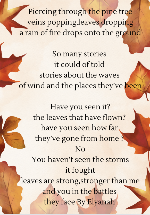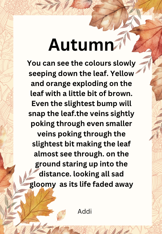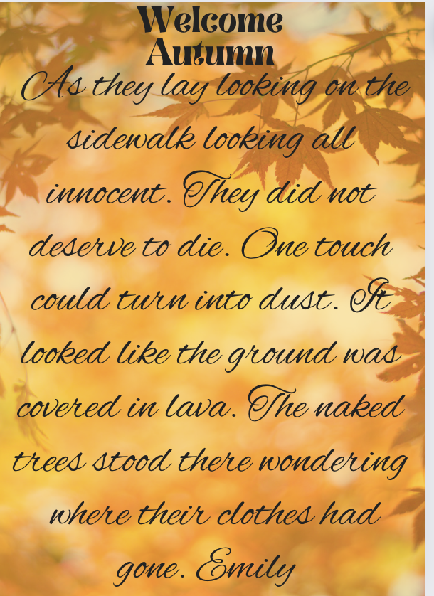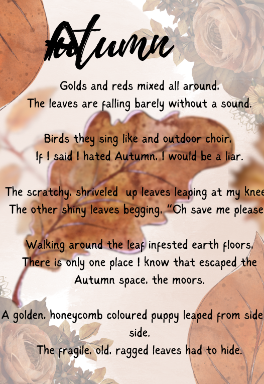The leaves make a satisfying crunch as I sit on the river bank. The crisp air brushes against my cheeks and a page of my book turns over slowly.The stream bounces along the rocks. The sun melts away like ice cream, into the horizon to make an amber sky. Dappled light shines through the trees, the remaining leaves cling to the tree holding on using all their energy. Soggy leaves, are shades of amber, fiery red and dusty browns, coat the roots of a huge oak tree. The smell of rotting leaves fills the air and birds weave through the branches. The sun continues to slip behind the horizon and soon stars will fill the sky; I want this moment to last forever. Emily Cone - Room 8