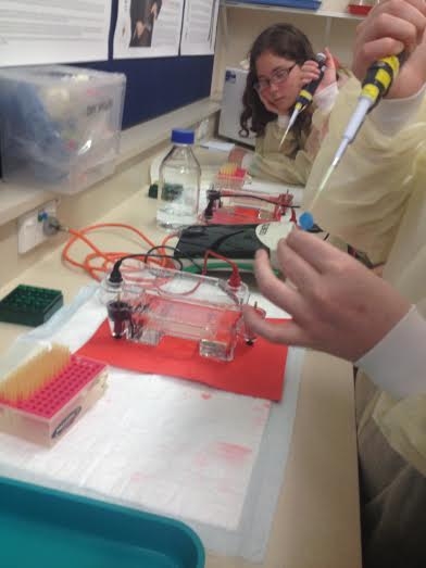 The first thing we saw as we walked in was a crime scene with a "body" guarded by the "police". Our first challenge was to solve the crime! We were in the biochemistry lab where we had workstations set up to practice using the equipment we would need. Once we were trained with the special techniques needed, we then had samples of DNA from the four suspects to match to blood found at the scene. We carefully placed samples of DNA into a special gel which then had an electrical run through it to separate the DNA strands. This was left for an hour before we then took our samples upstairs to view under a special UV light before a photo was taken of the results. From this we could match the DNA to the blood at the scene and work out who did it!!