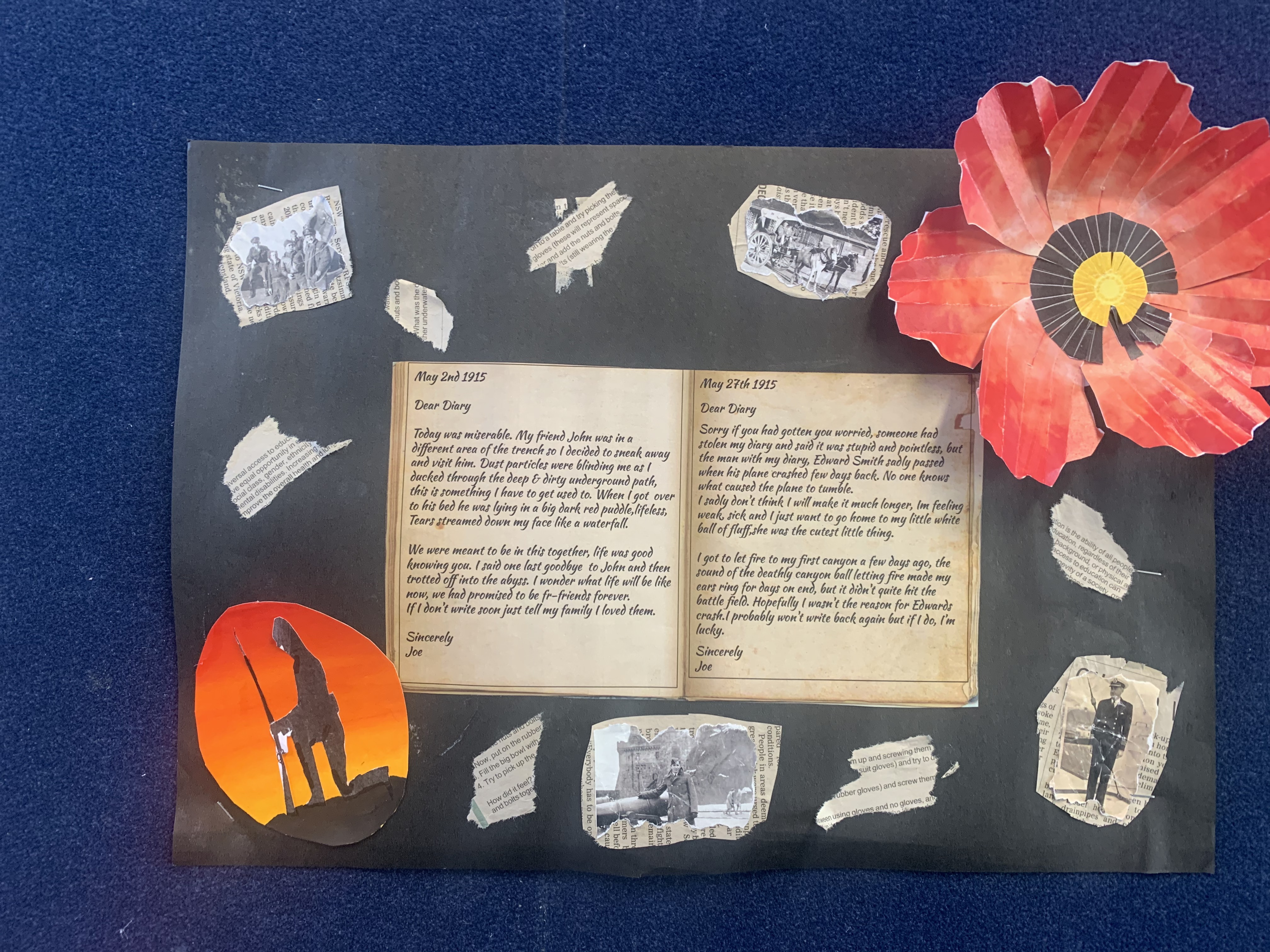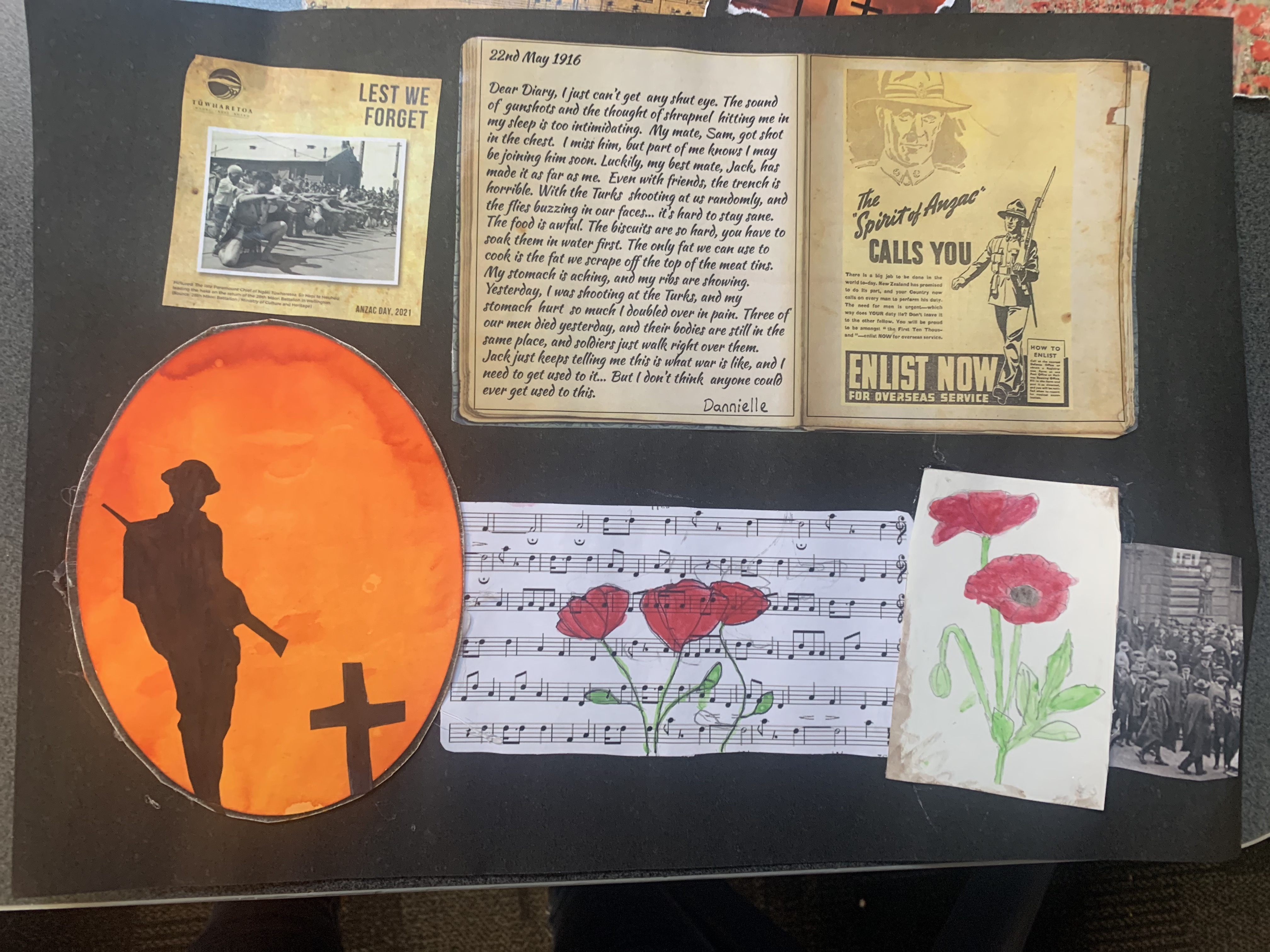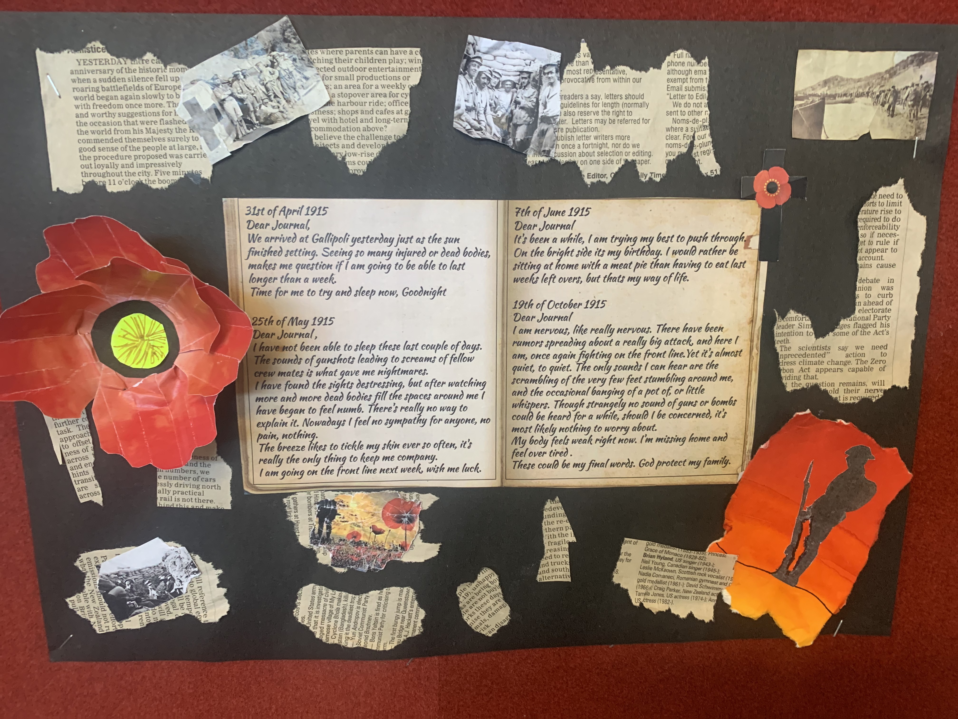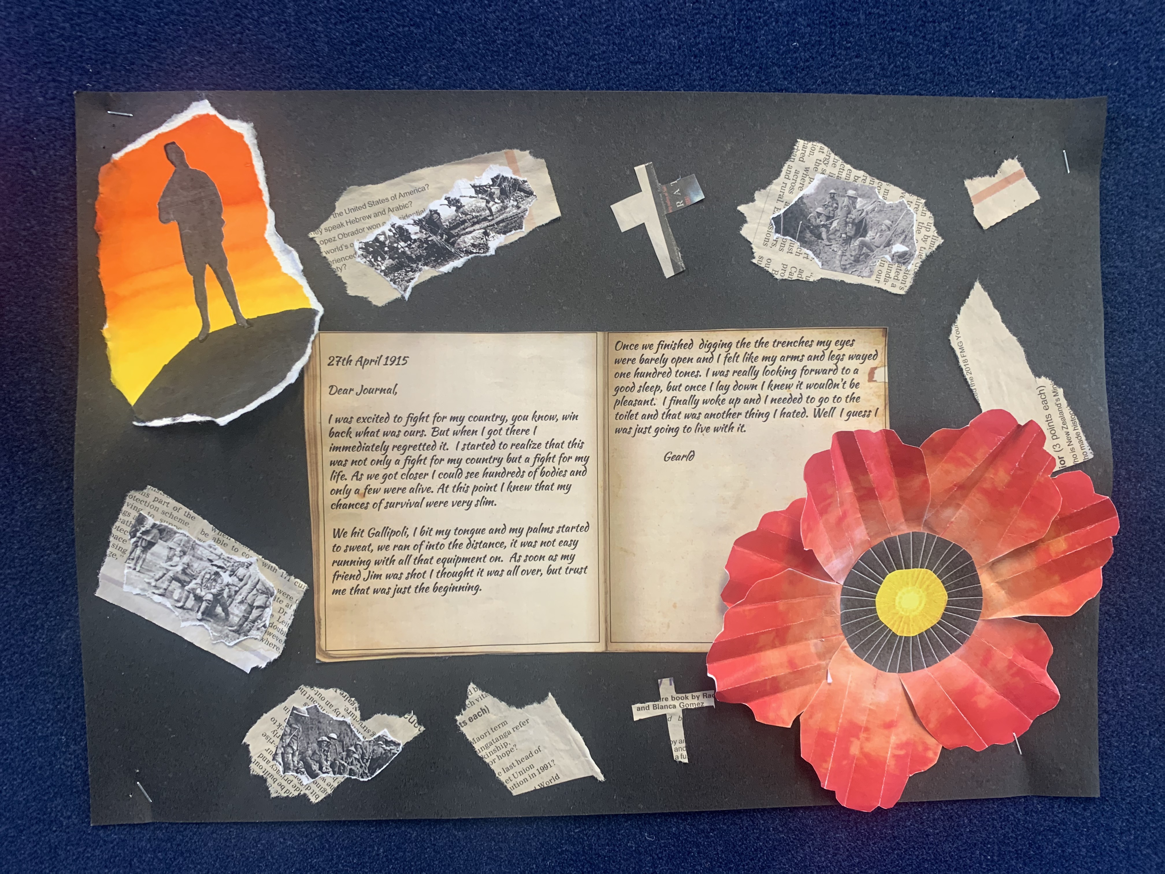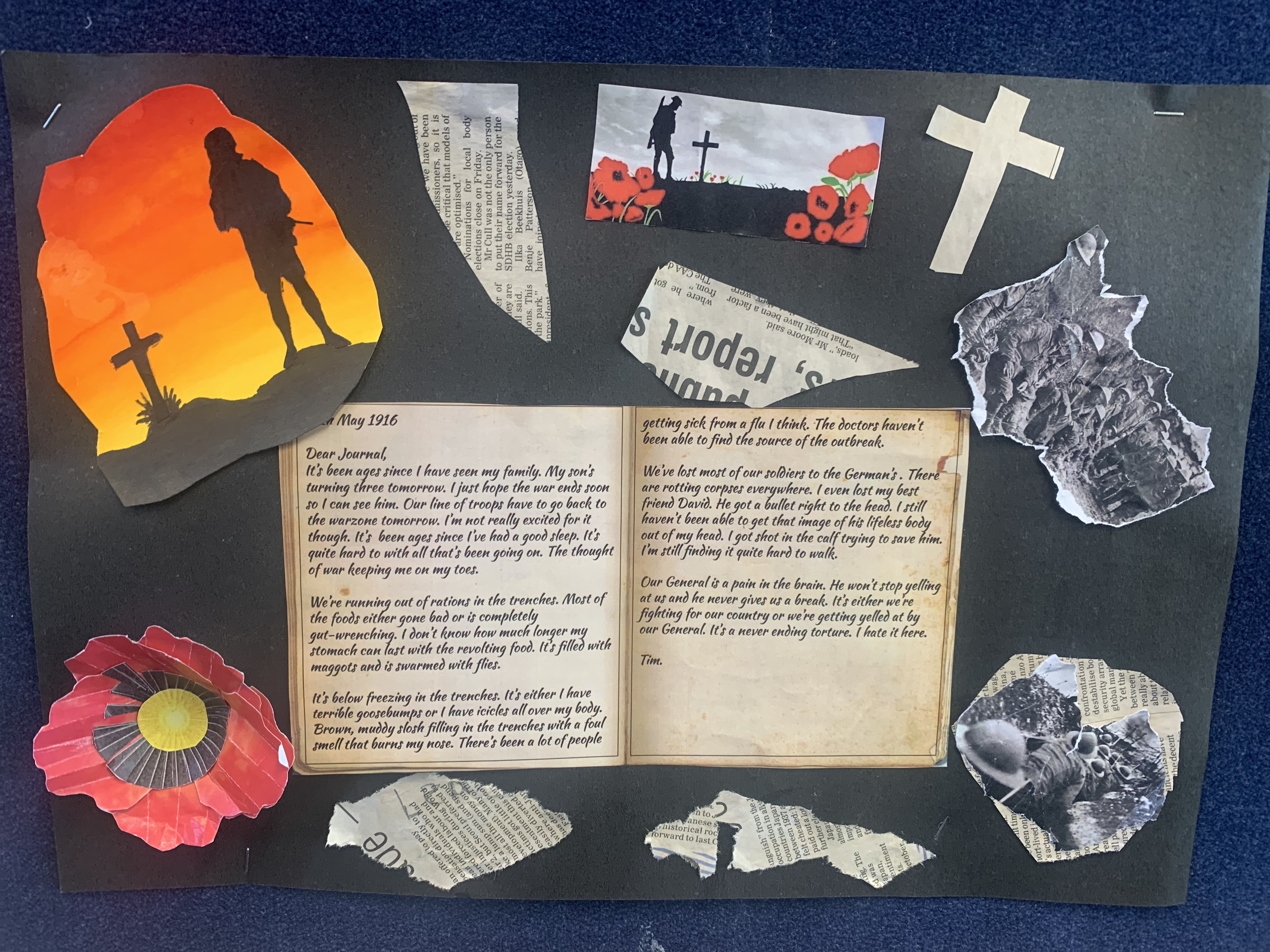 Dear Diary, I just can’t get any shut eye. The sound of gunshots and the thought of shrapnel hitting me in my sleep is too intimidating. My mate, Sam, got shot in the chest. I miss him, but part of me knows I may be joining him soon. Luckily, my best mate, Jack, has made it as far as me. Even with friends, the trench is horrible. With the Turks shooting at us randomly, and the flies buzzing in our faces… it’s hard to stay sane. The food is awful. The biscuits are so hard, you have to soak them in water first. The only fat we can use to cook is the fat we scrape off the top of the meat tins. My stomach is aching, and my ribs are showing. Yesterday, I was shooting at the Turks, and my stomach hurt so much I doubled over in pain. Three of our men died yesterday, and their bodies are still in the same place, and soldiers just walk right over them.