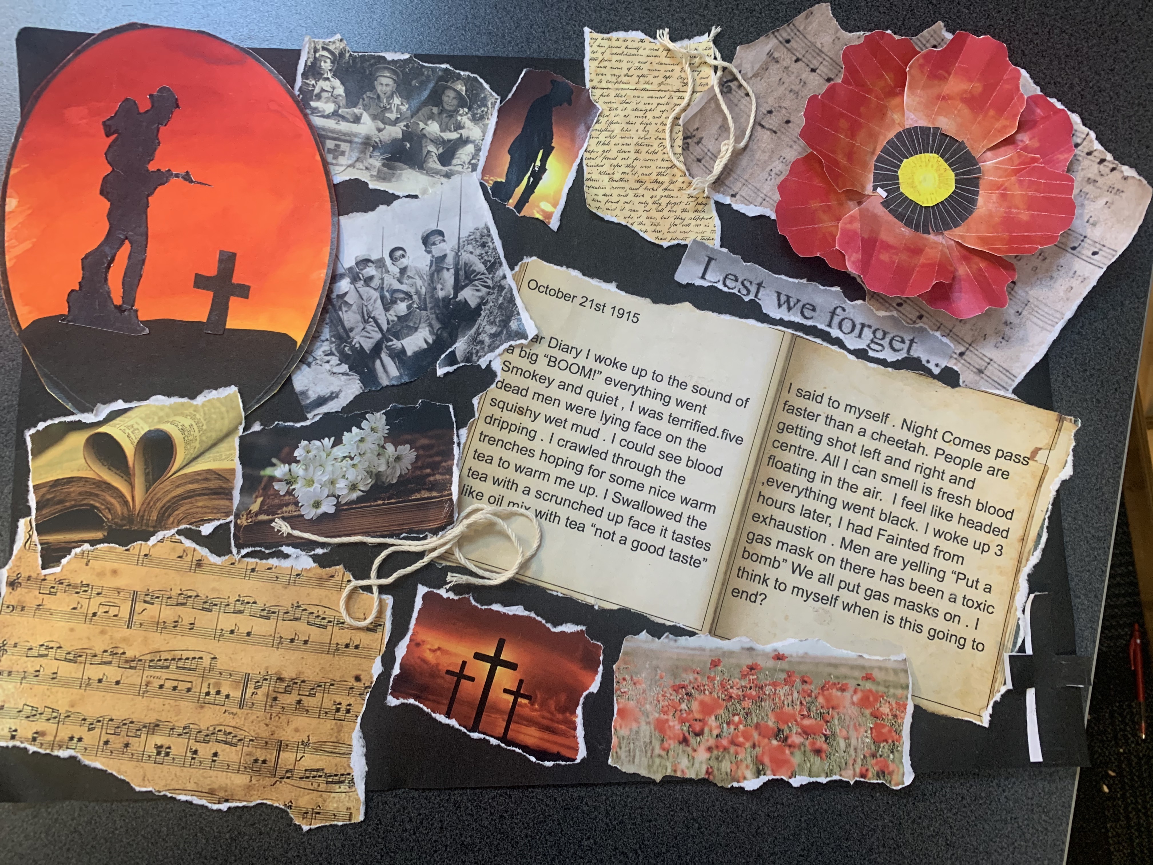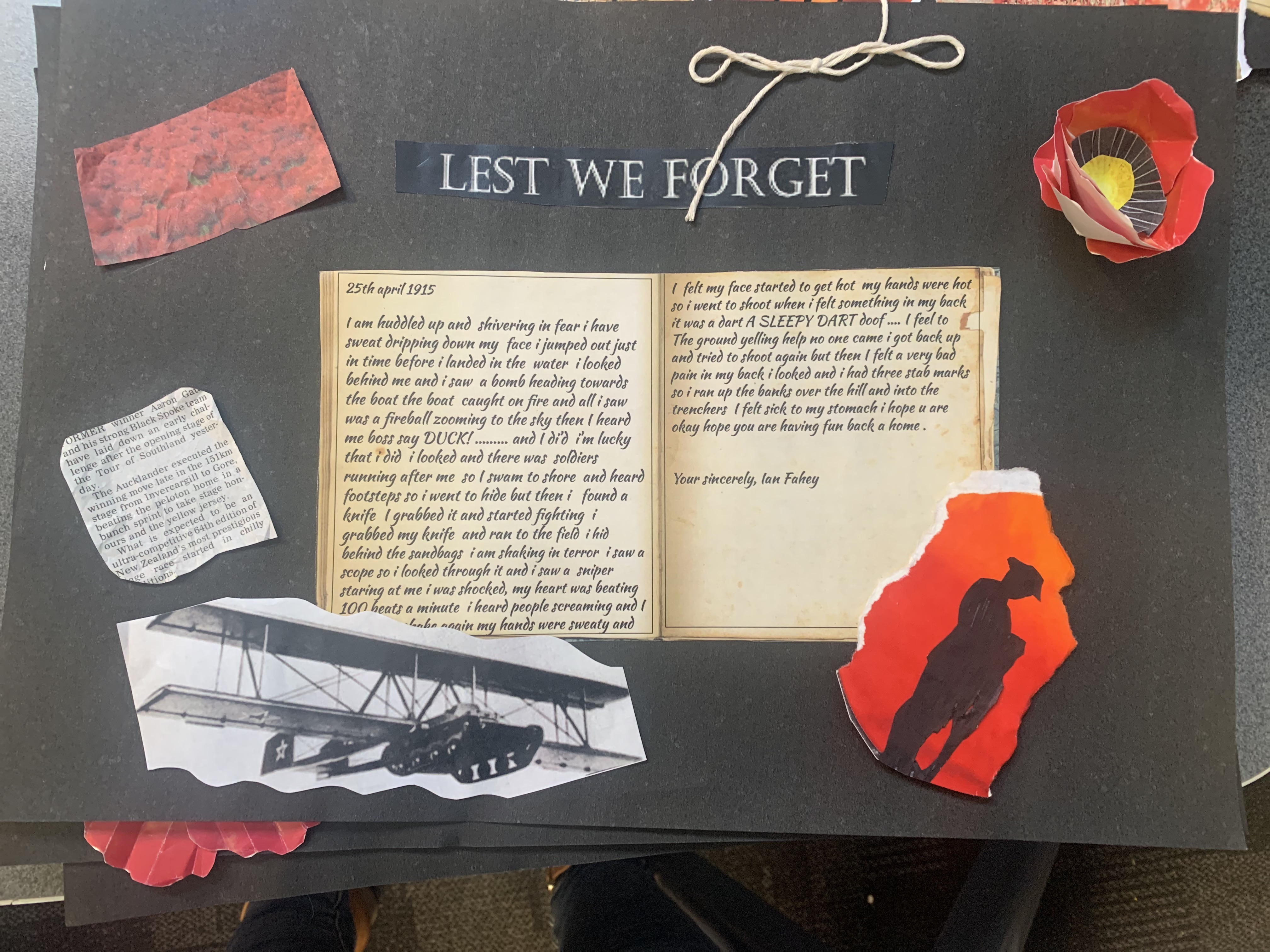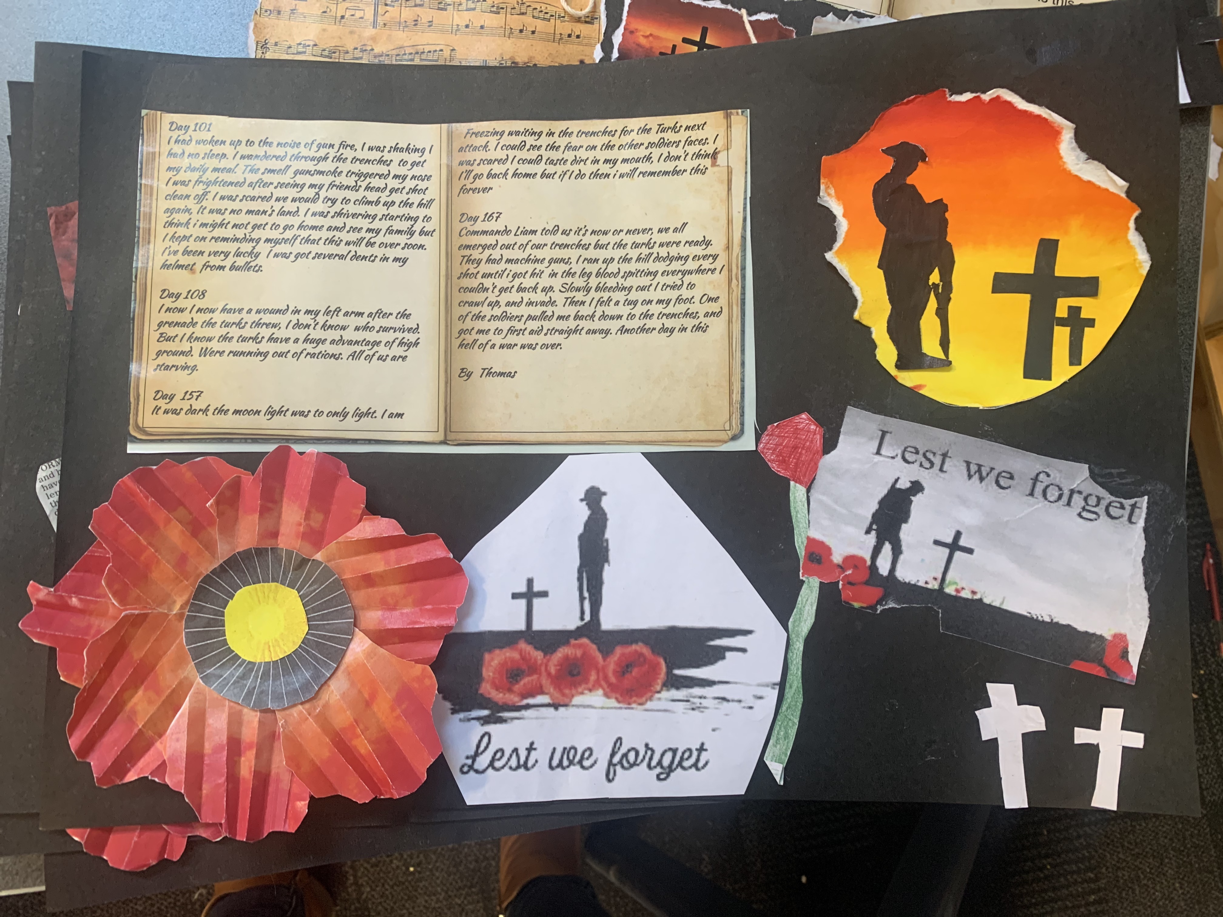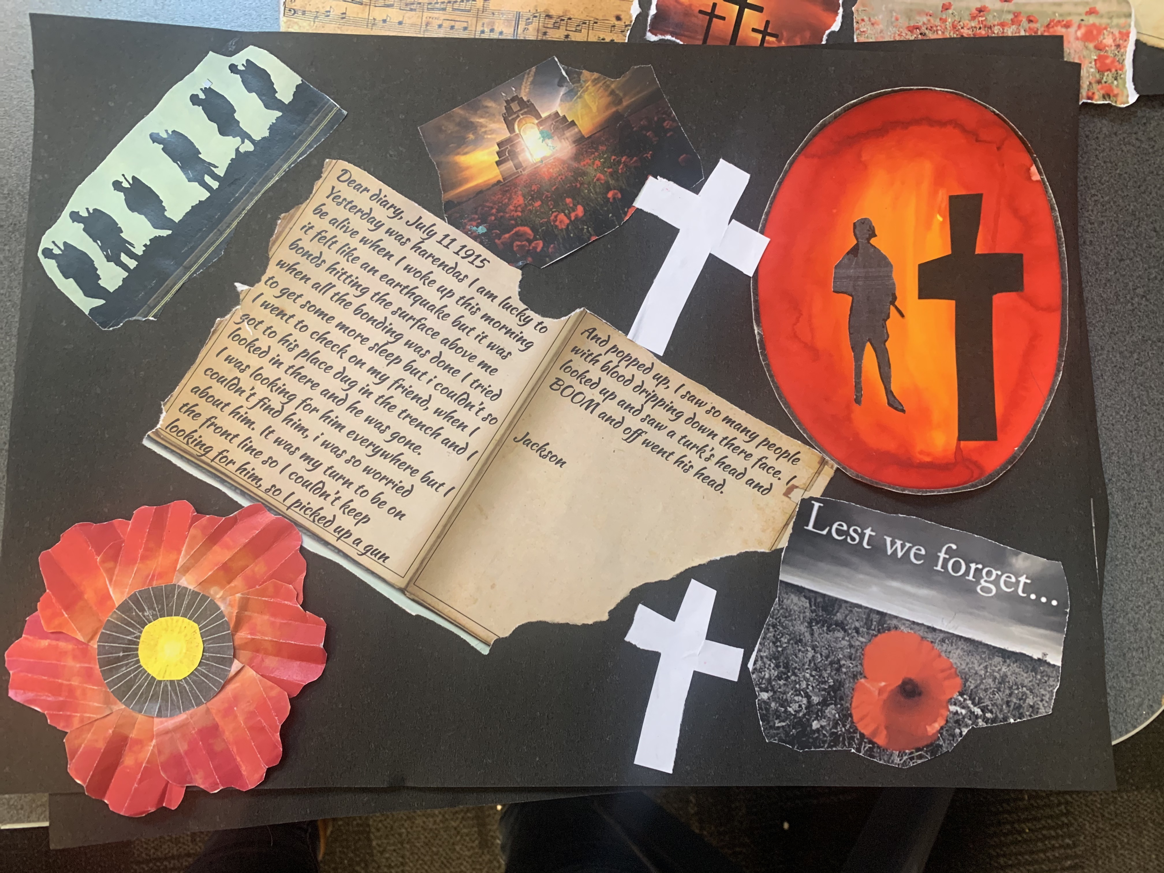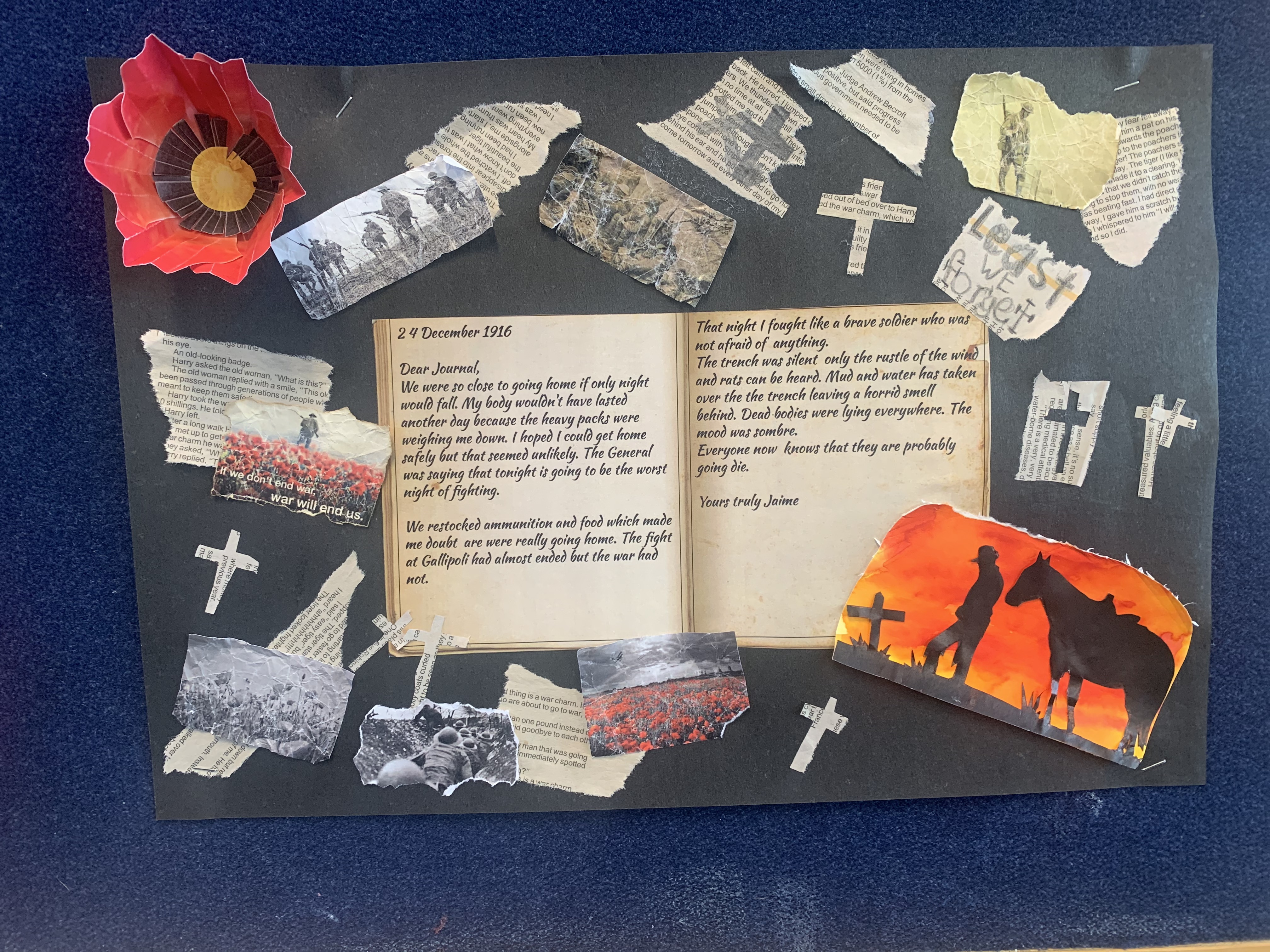 Dear Diary, I just can’t get any shut eye. The sound of gunshots and the thought of shrapnel hitting me in my sleep is too intimidating. My mate, Sam, got shot in the chest. I miss him, but part of me knows I may be joining him soon. Luckily, my best mate, Jack, has made it as far as me. Even with friends, the trench is horrible. With the Turks shooting at us randomly, and the flies buzzing in our faces… it’s hard to stay sane. The food is awful. The biscuits are so hard, you have to soak them in water first. The only fat we can use to cook is the fat we scrape off the top of the meat tins. My stomach is aching, and my ribs are showing. Yesterday, I was shooting at the Turks, and my stomach hurt so much I doubled over in pain. Three of our men died yesterday, and their bodies are still in the same place, and soldiers just walk right over them.