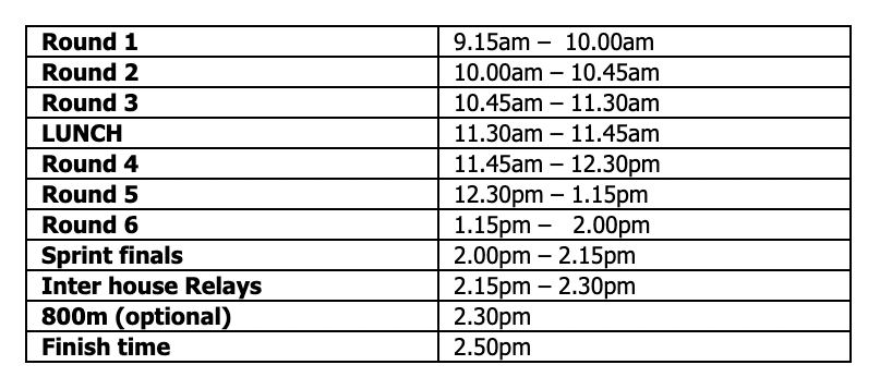 The students will need to be dropped off at the Caledonian by 8:50 a.m. and they need to be picked up at the conclusion of the day, at 3 p.m. The students are expected to compete in all of the events throughout the day, competing for house points and the opportunity to represent the school at the North Zones and Otago Athletics. We encourage students to come in their house colours but there must be NO face paint, vivid or body paint used at the Caledonian or before arrival. If students are not wearing their house colours then they come in school PE gear. Students need to bring their own packed lunch, they will not be able to buy food or drink at the grounds.