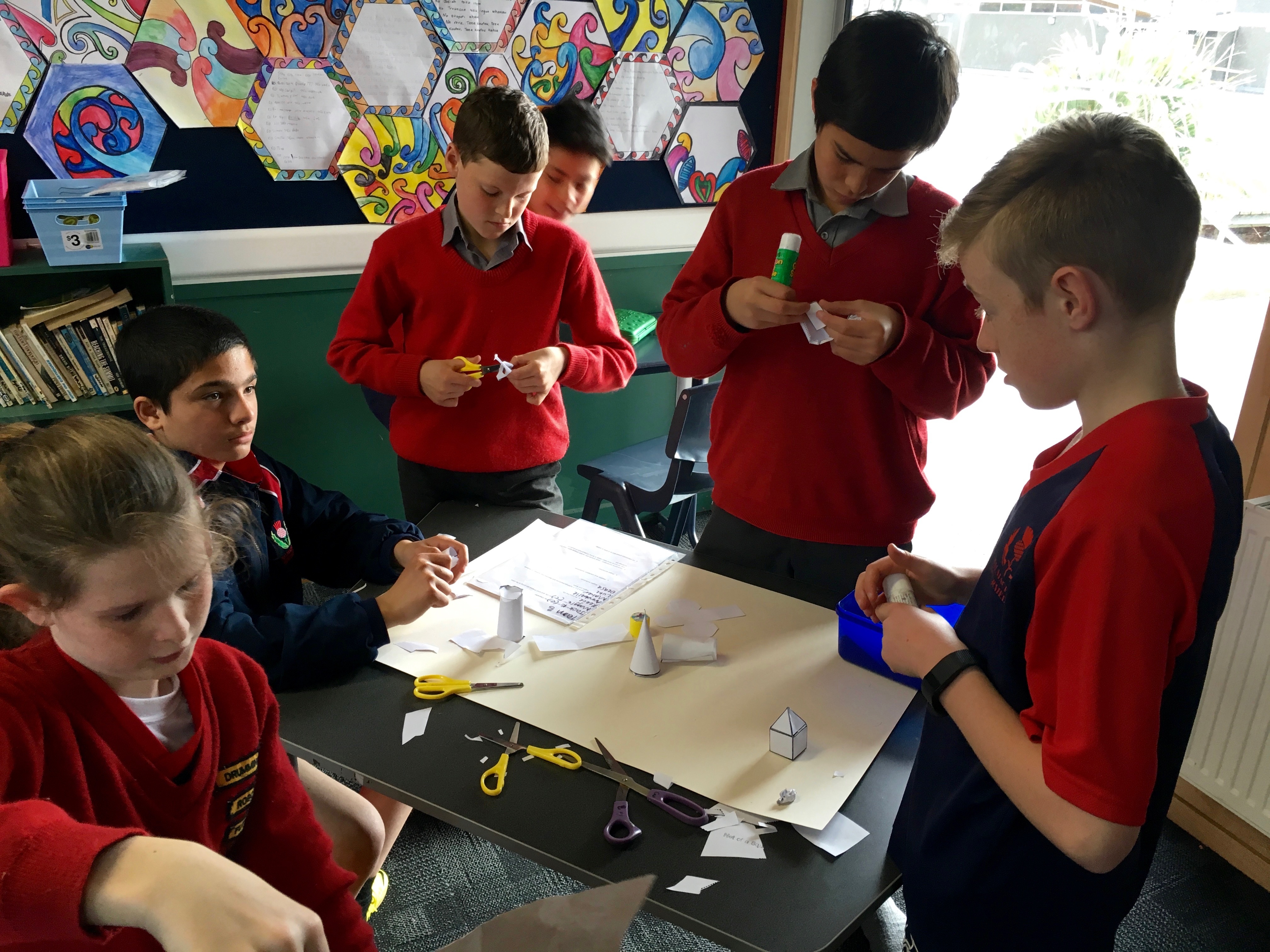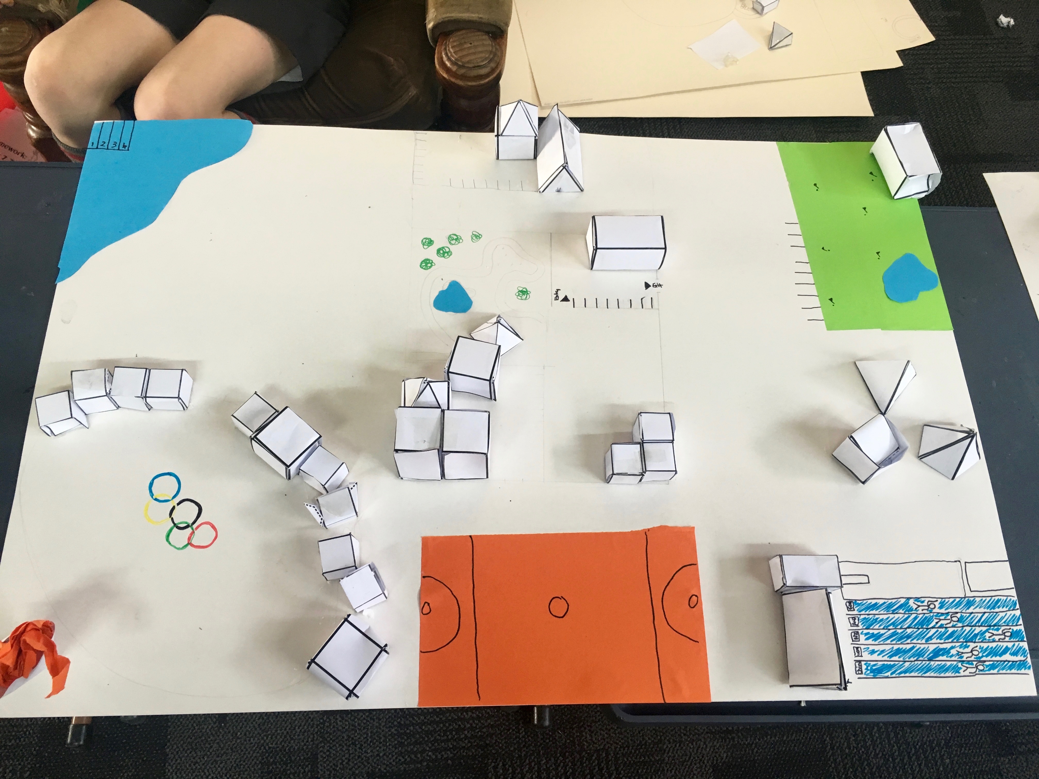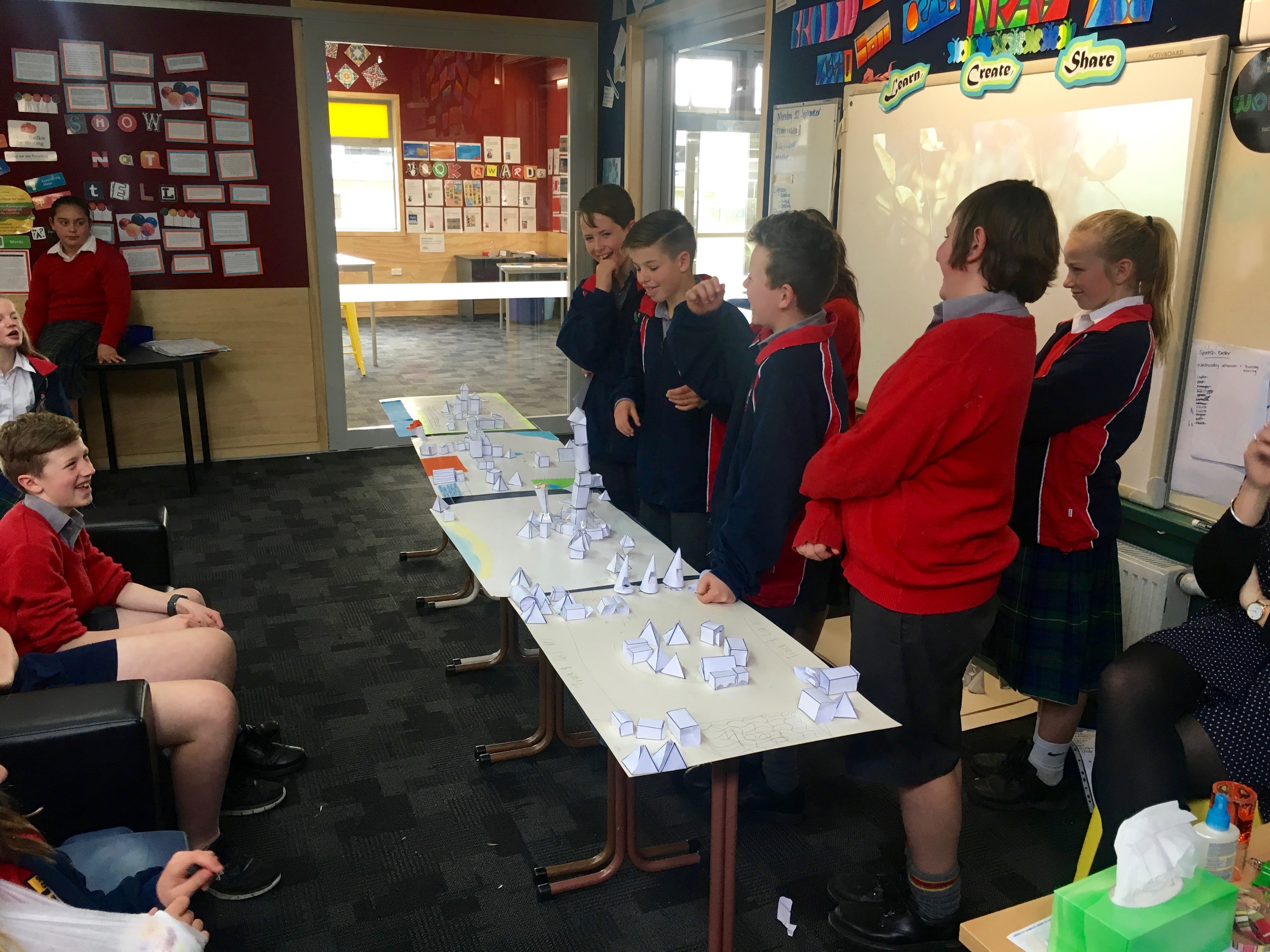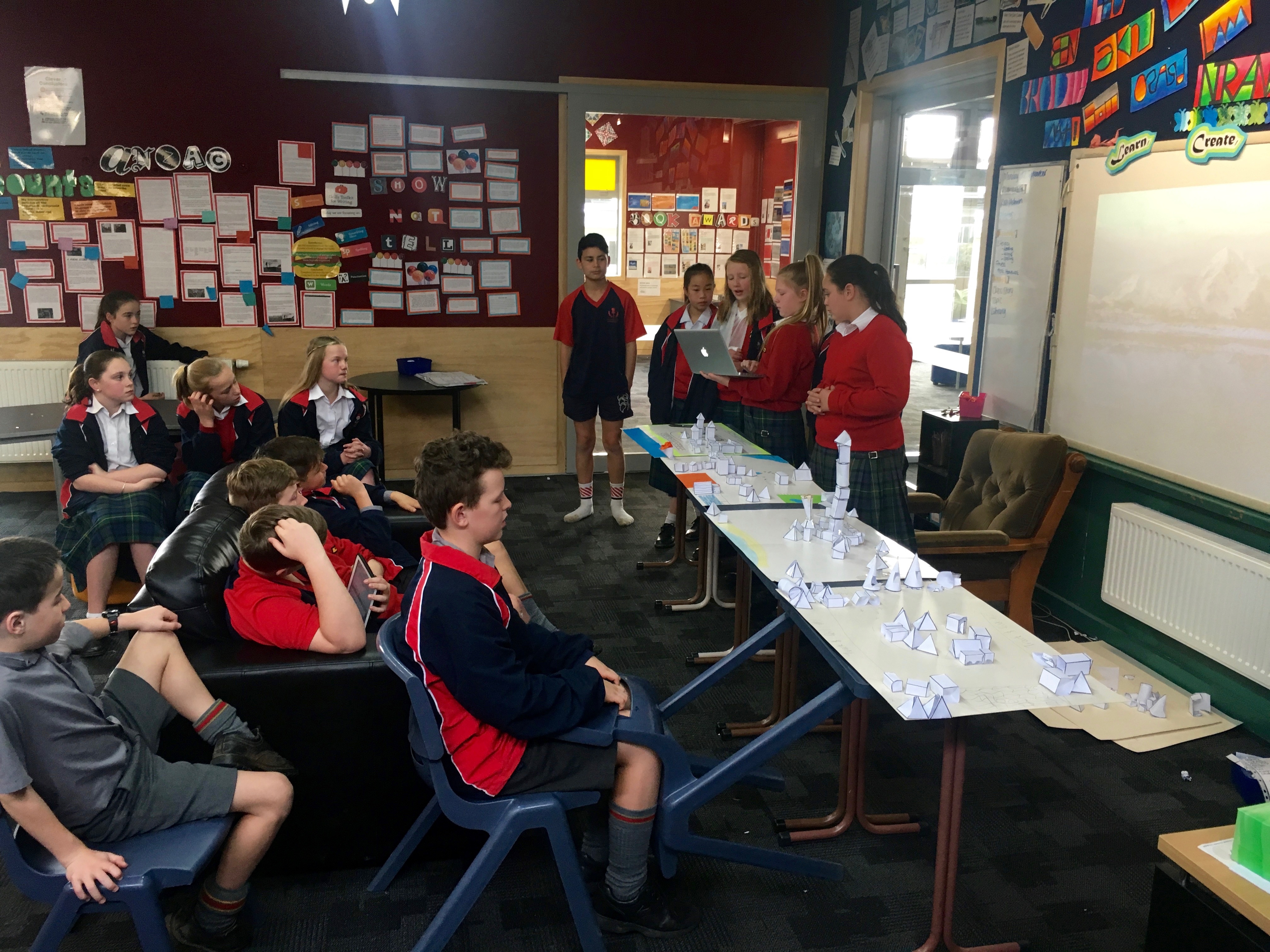 Over the last few weeks both Room 9 and 14 have been doing some learning around geometry. In the last week of the unit both classes came together and were given a challenge to plan, create and share a city fit to host the Olympics using only geometrical nets.