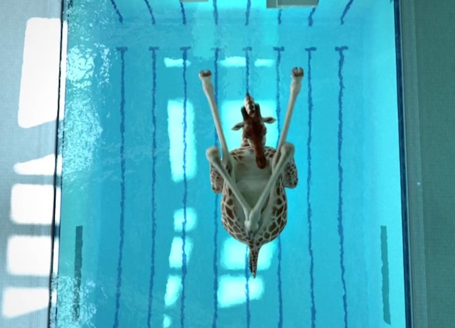 Slowly a giraffe was lowered from the ceiling on a half-broken crane that looked like it would snap without warning. The first giraffe launched from a standstill position and clattered across the diving board.