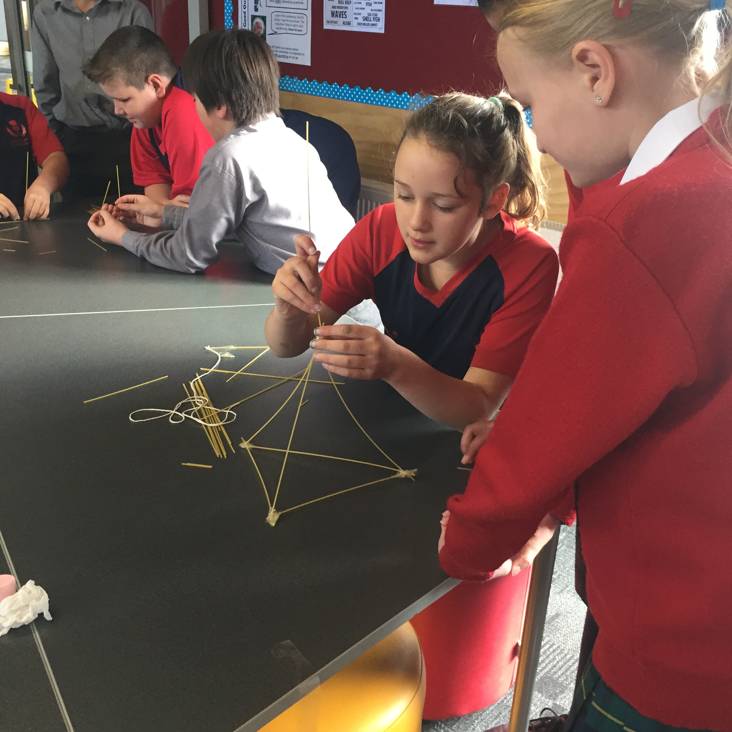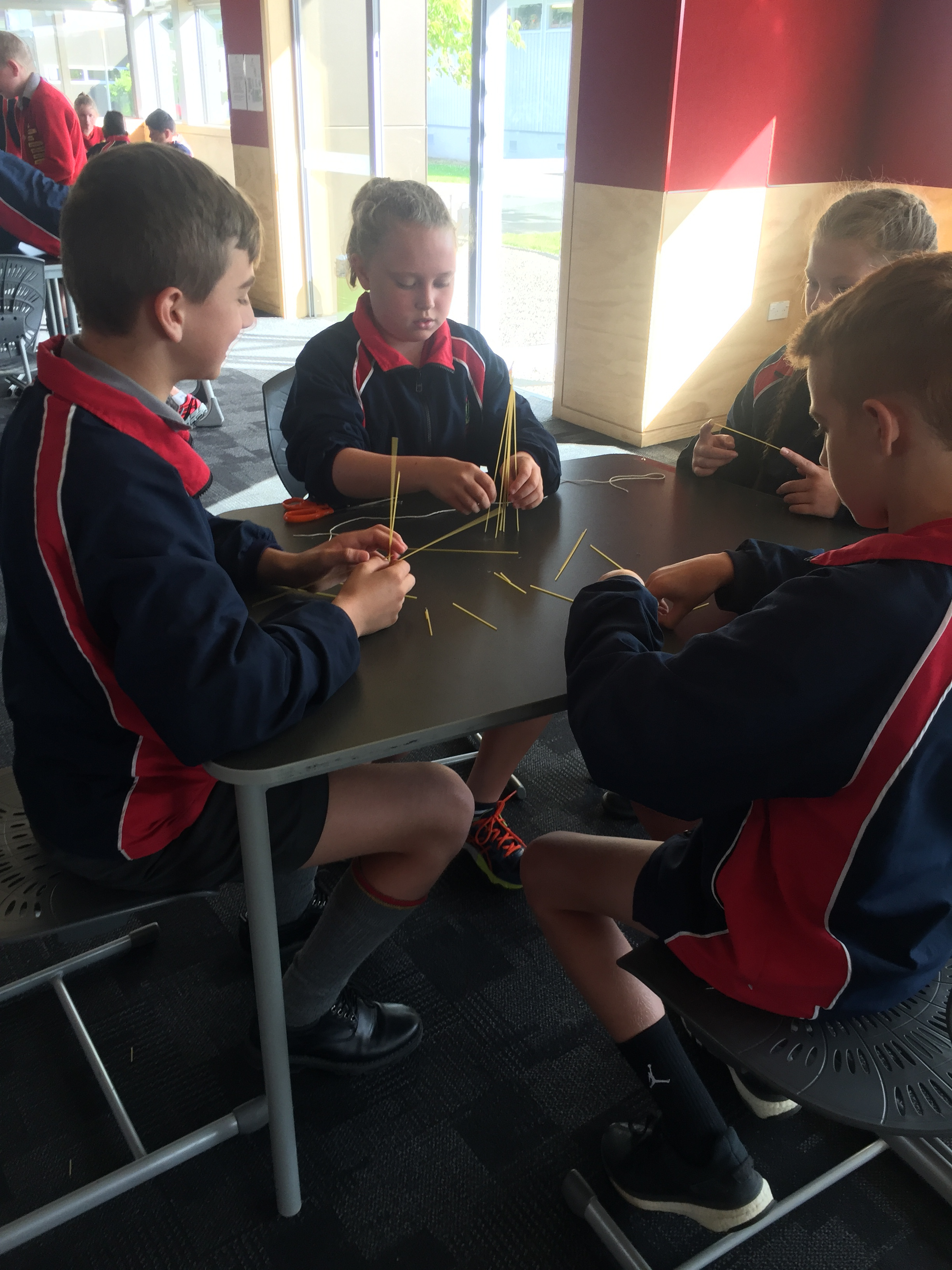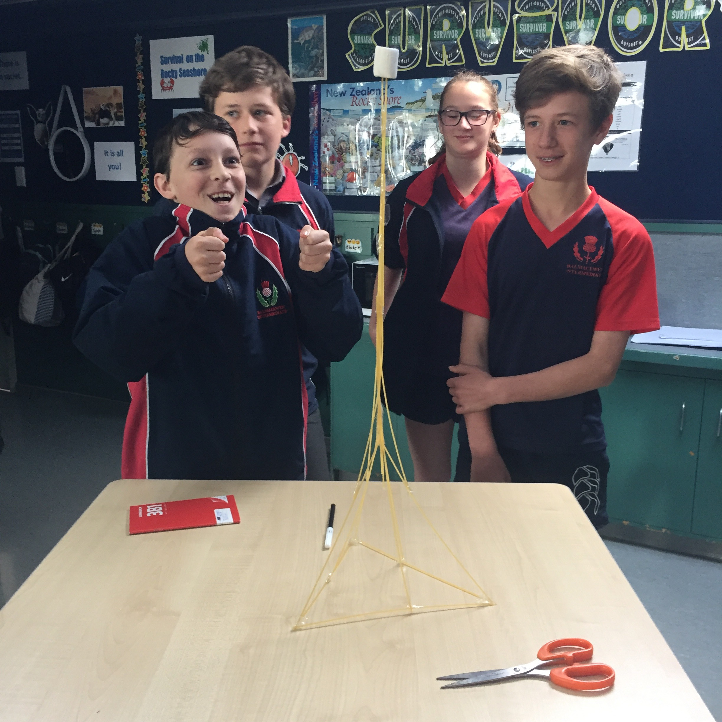 “Head into Room 7 please,” Ms. Dixon stated as the crowd moved into Room 7 and sat down quietly. The projector lit up the whiteboard with a powerpoint, Ms. Dixon read along as the powerpoint flipped pages. She said “Now we will be doing the activity, you will get 20 strands of raw spaghetti, 1 marshmallow, 1 metre of string and 1 metre of tape and a pair of scissors.”
