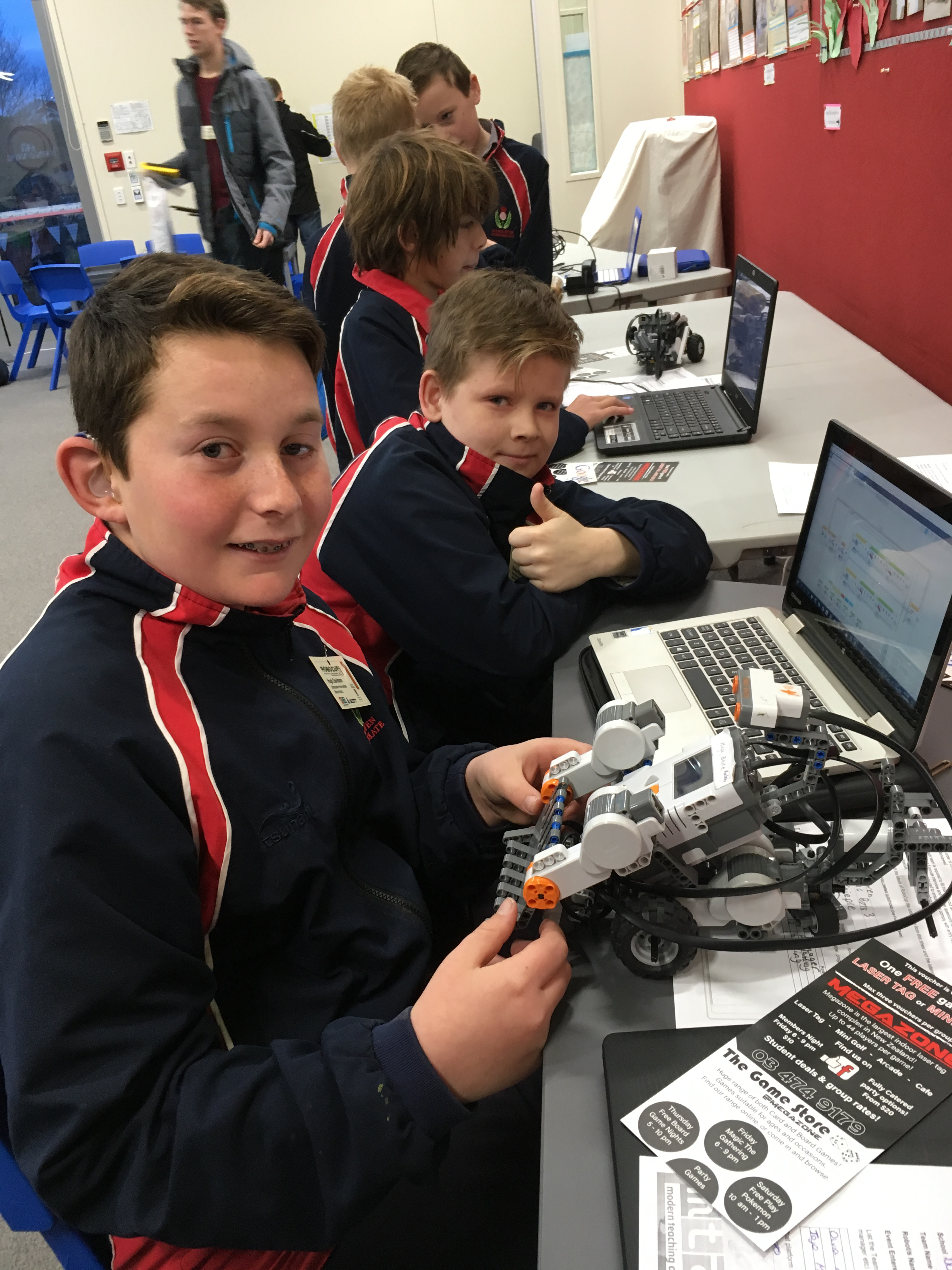 Aaron had been working hard on his soccer robots. This involves programming 2 robots. One for attack and one for defence. As Aaron was the only entry in Junior soccer he played 3 "friendlies" against Senior teams.