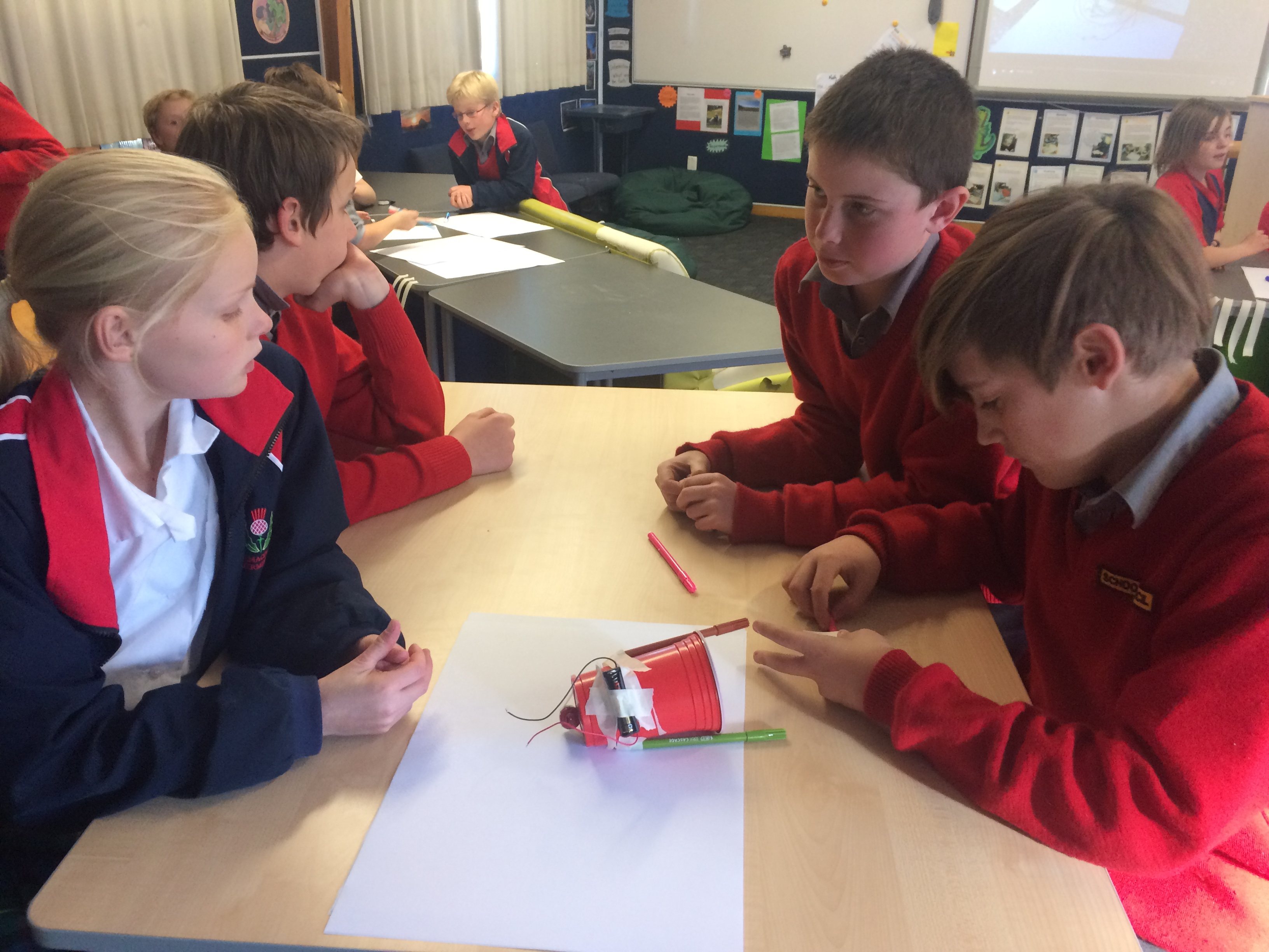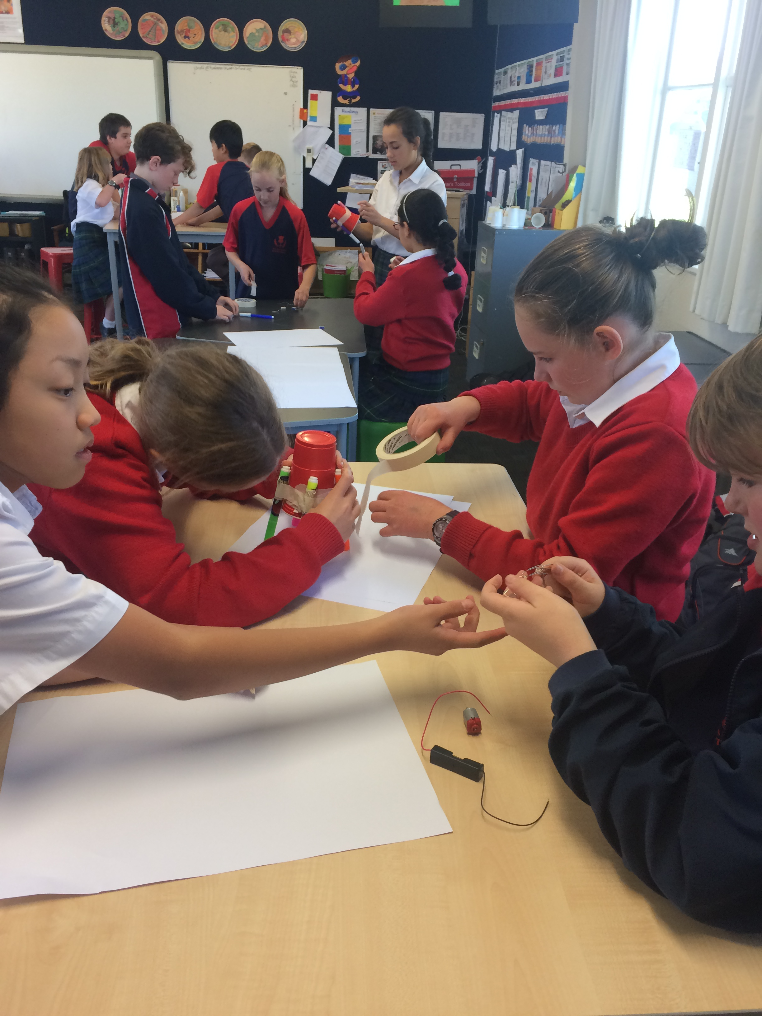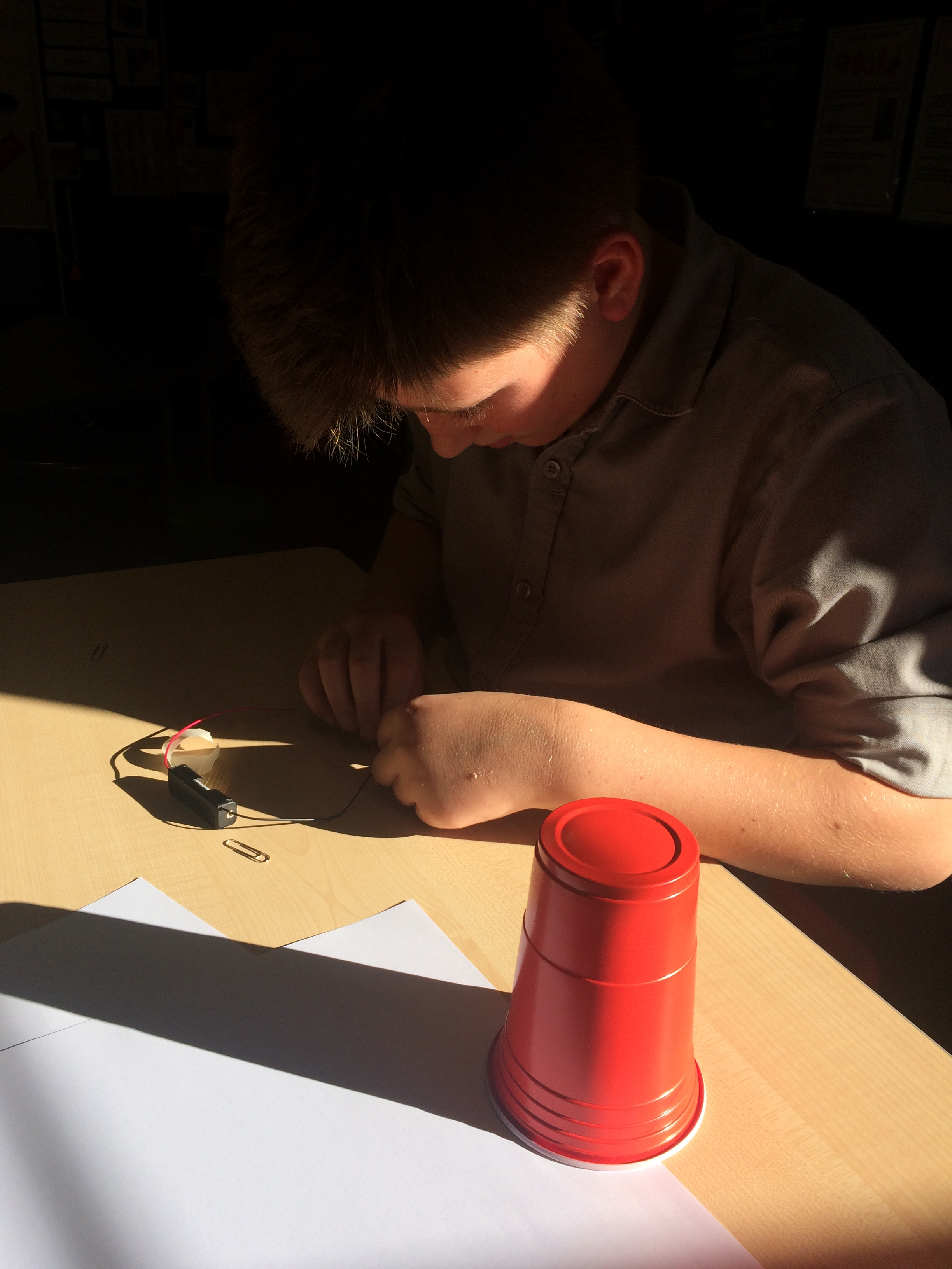 The resources were laid out in front of them; 1 paper cup, AAA battery, wires, 1 rubber and a motor. Students quickly made the connection and had there motors purring.