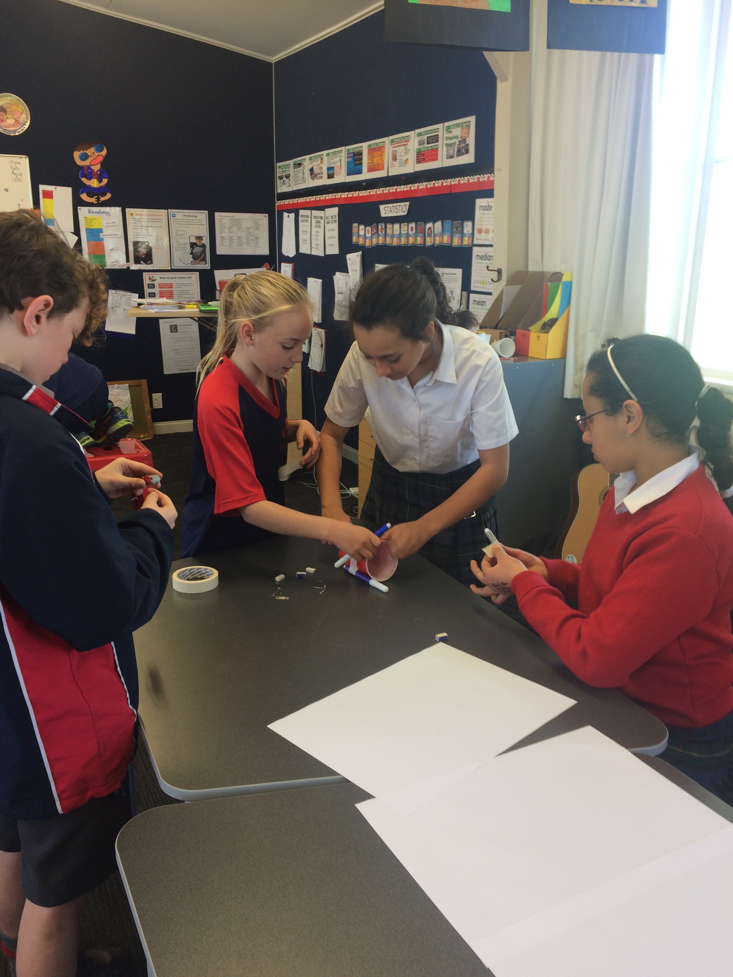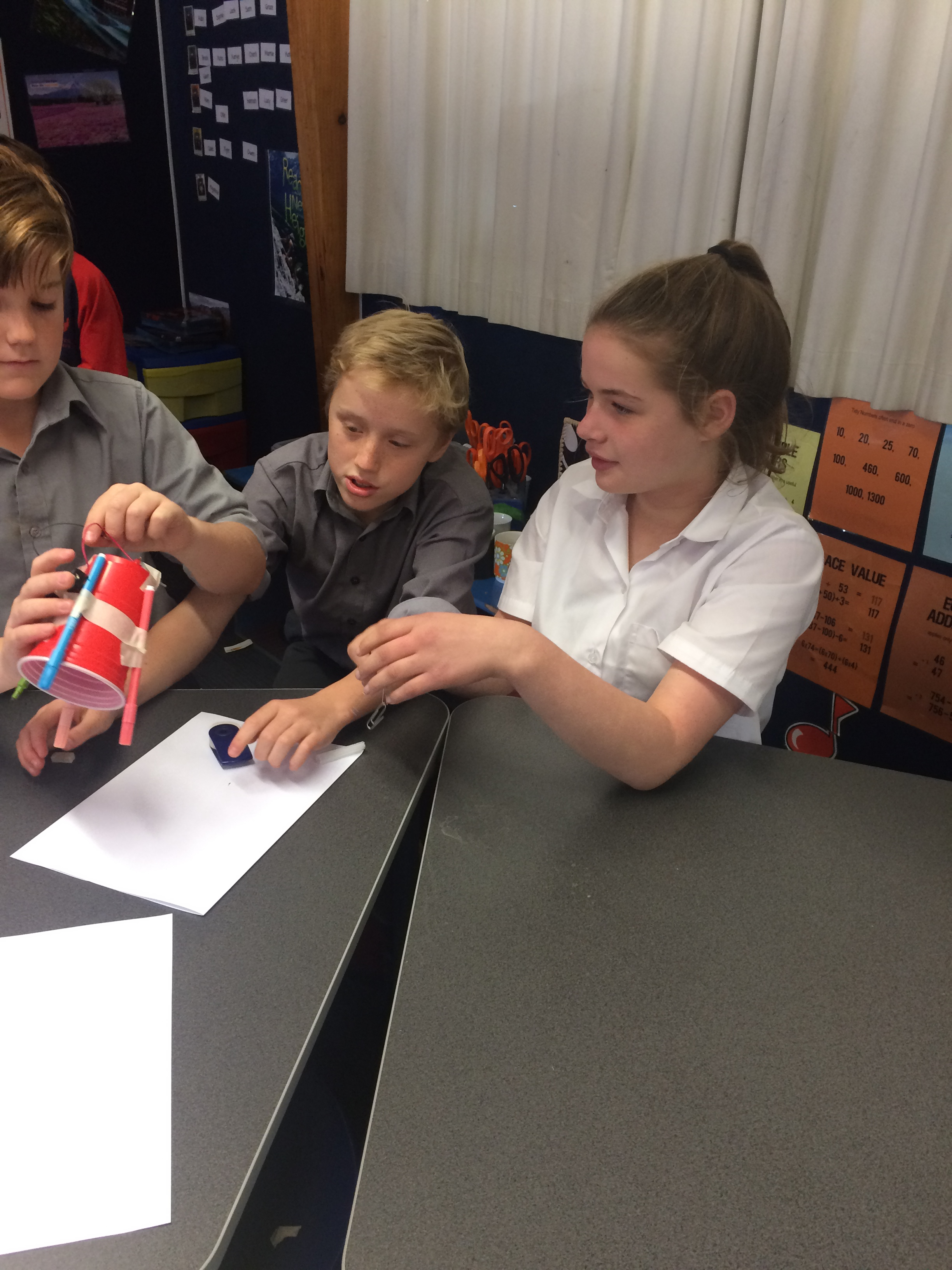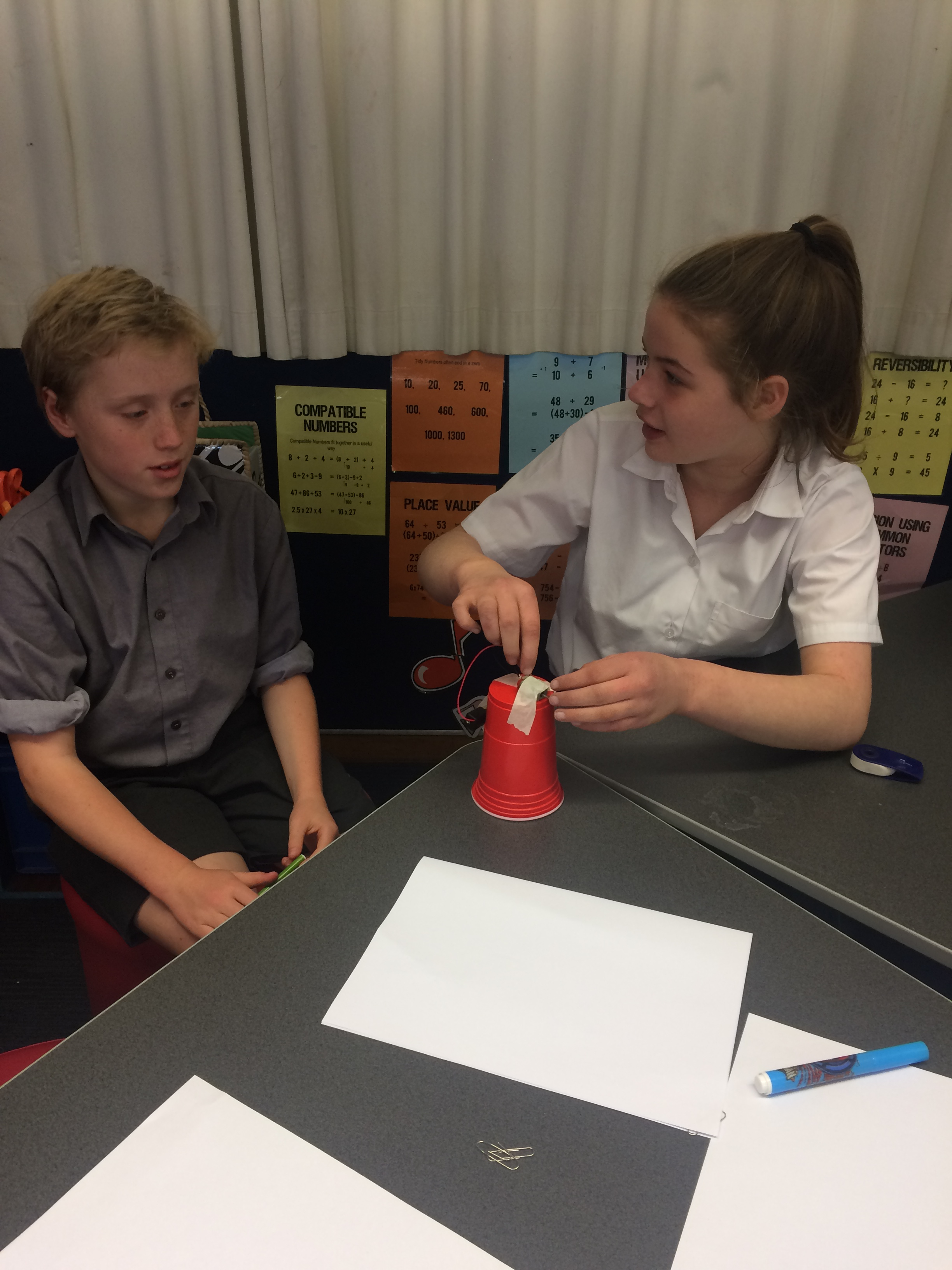 The resources were laid out in front of them; 1 paper cup, AAA battery, wires, 1 rubber and a motor. Students quickly made the connection and had there motors purring.