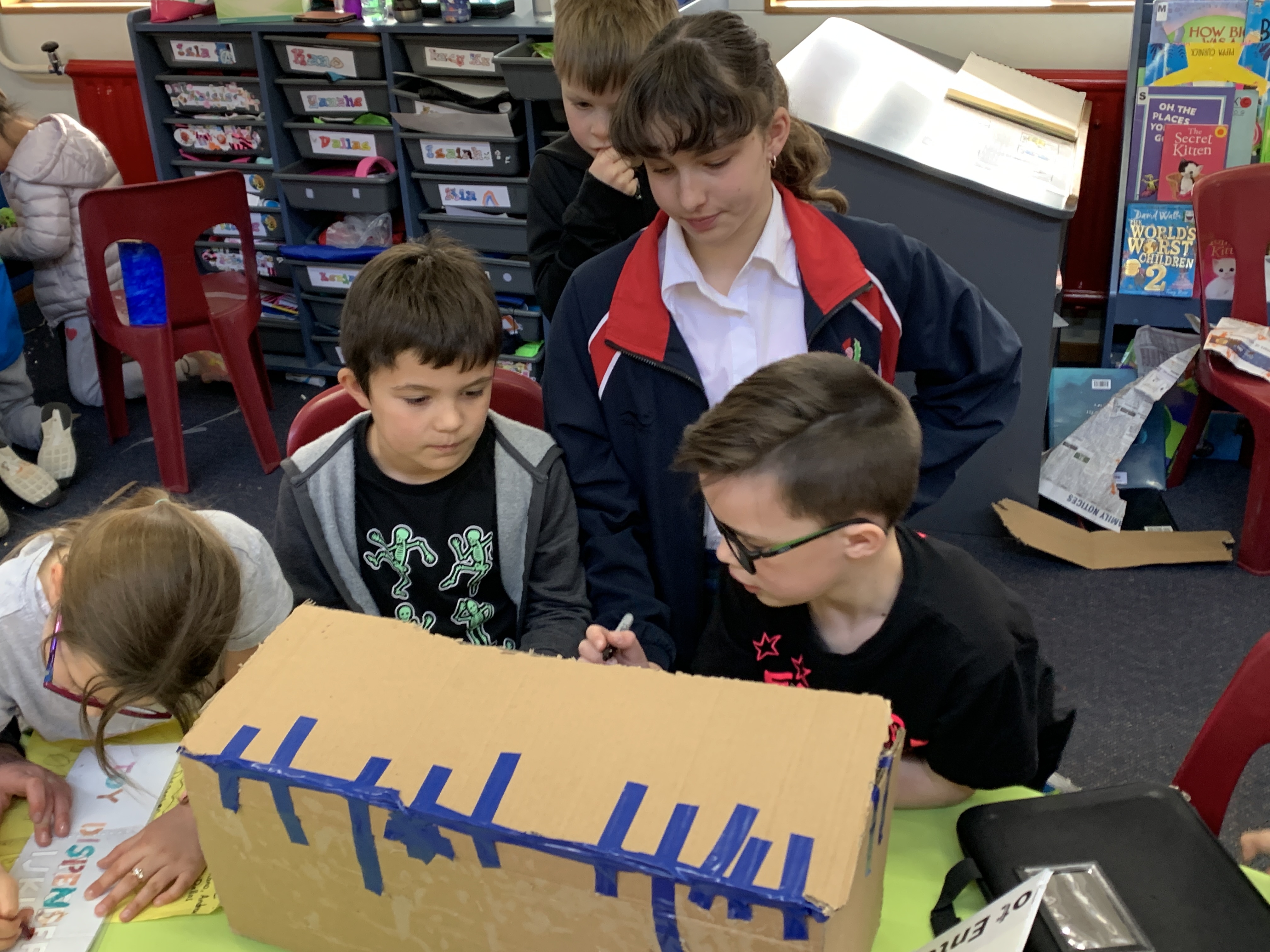 A group of students have been working with a class of Year 2 students at Maori Hill School to help them bring their Dunedin Hospital build ideas to life.