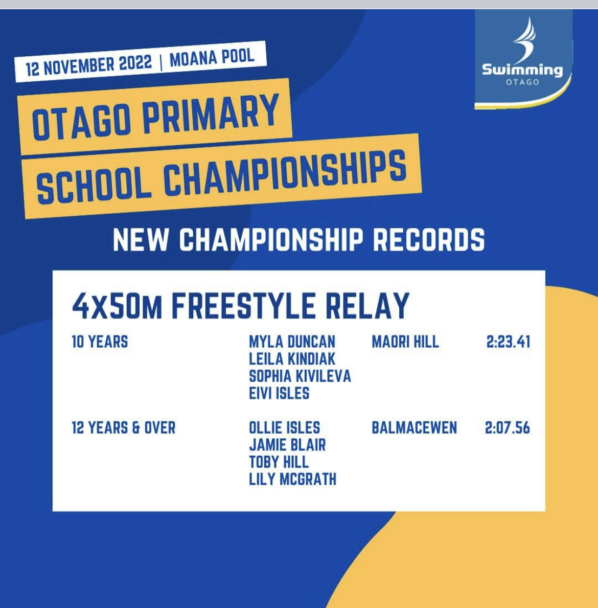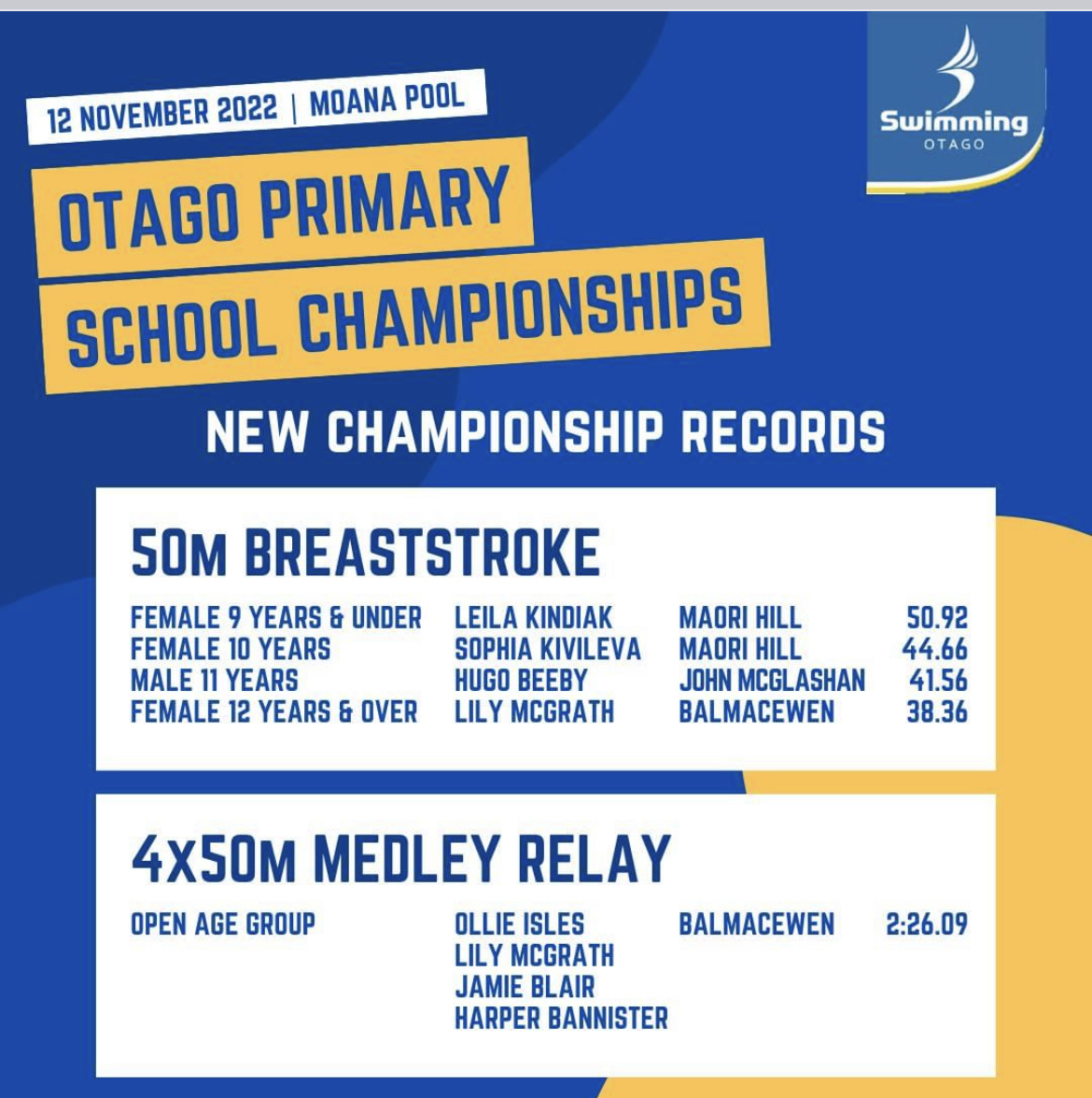 On Saturday 12th November we had a very strong swimming squad compete at the Otago Swimming championships held at Moana Pools. We had a large number of students participate in the 50m freestyle, breaststroke and breaststroke races as well as the relay and medley races.