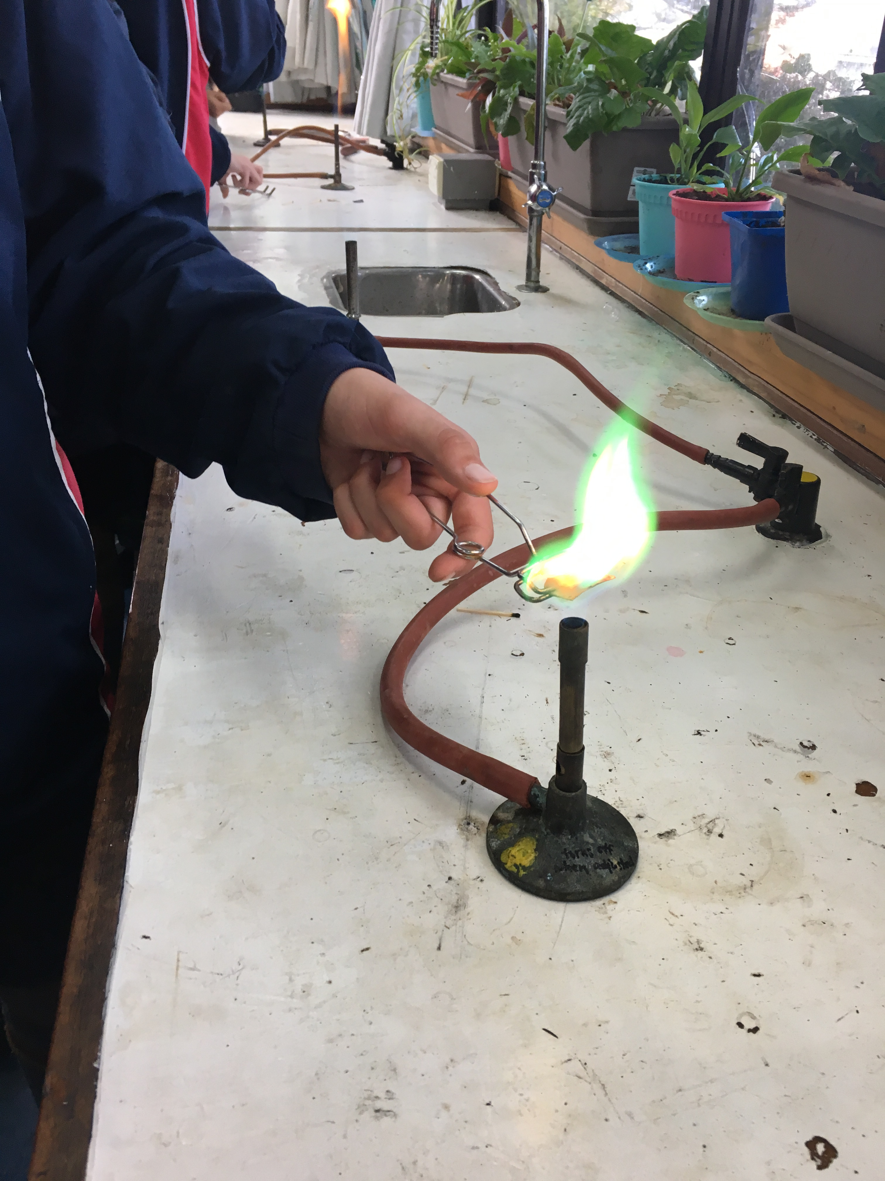 First he talked about the periodic table with one element… Copper, he showed a small slither of the copper as well as the bunsen burner (a stalk of metal which flows out gas when you turn it on to make a flame of fire). We then held the slice of copper above the burning flame to make copper oxide, which turned the copper completely black. After that we let the copper oxide sit in Hydrochloric acid which turned the water to a blue colour. After we filtered it we dropped two iron nails into the solution. It turned the nails into copper.