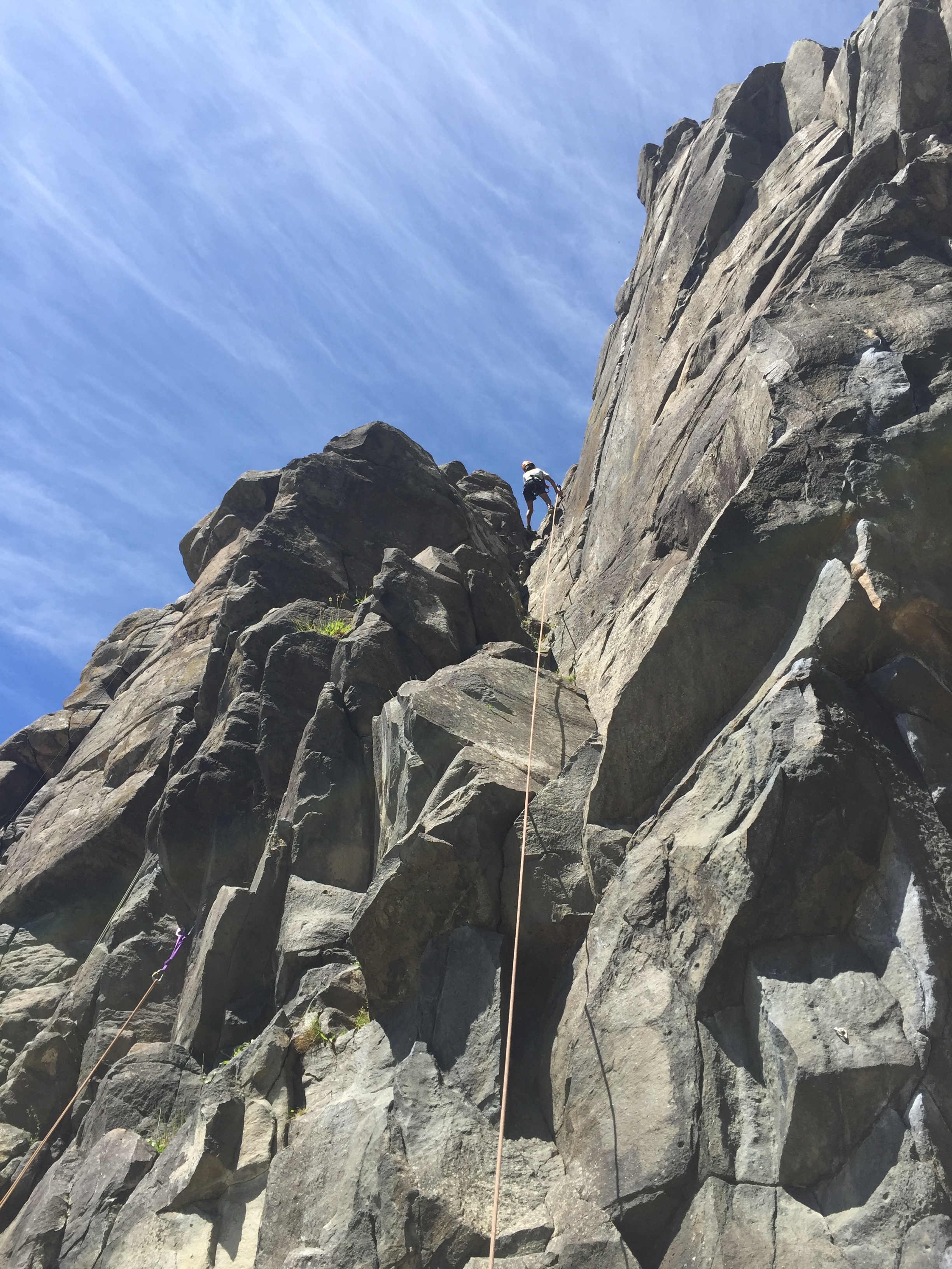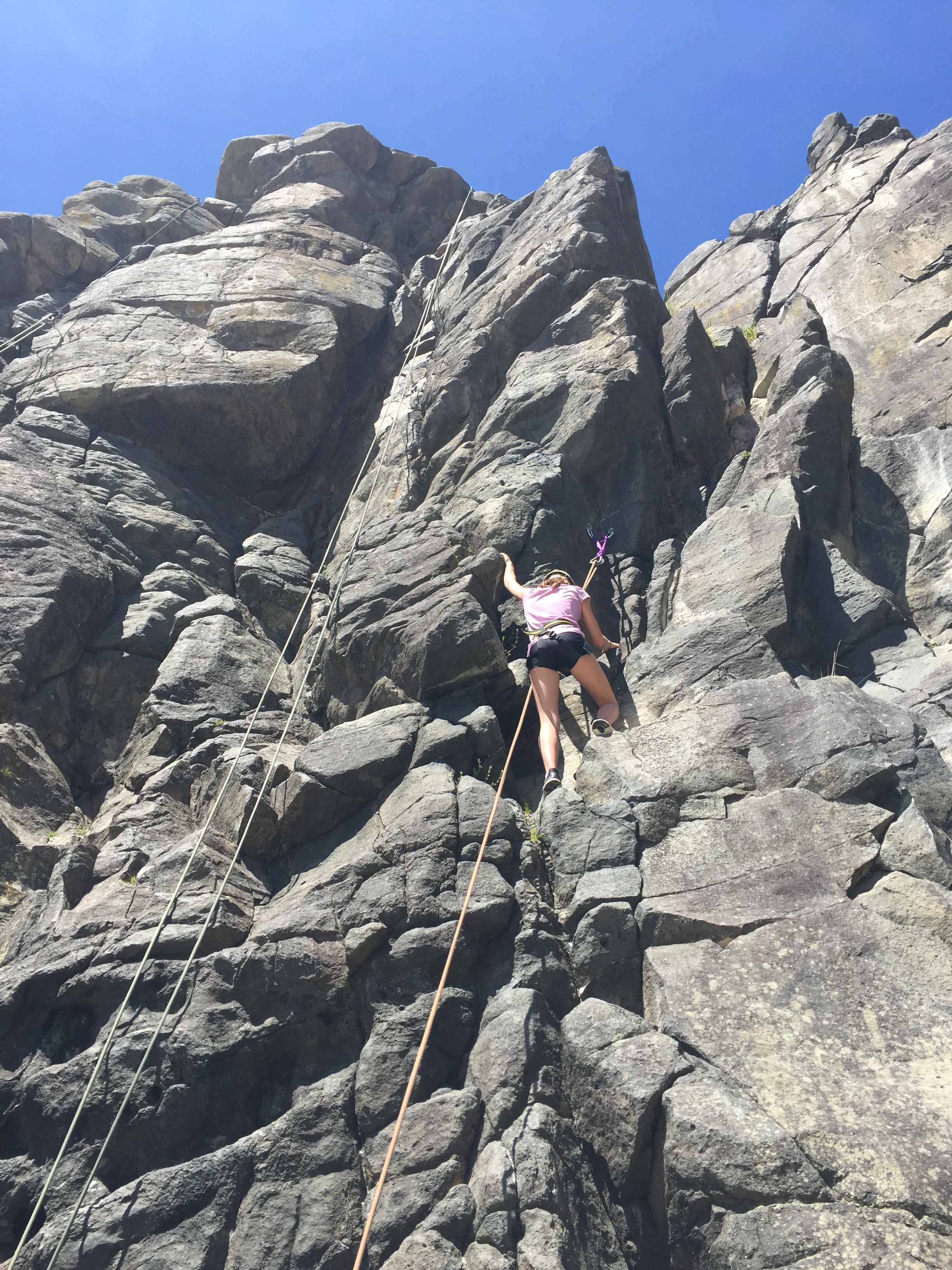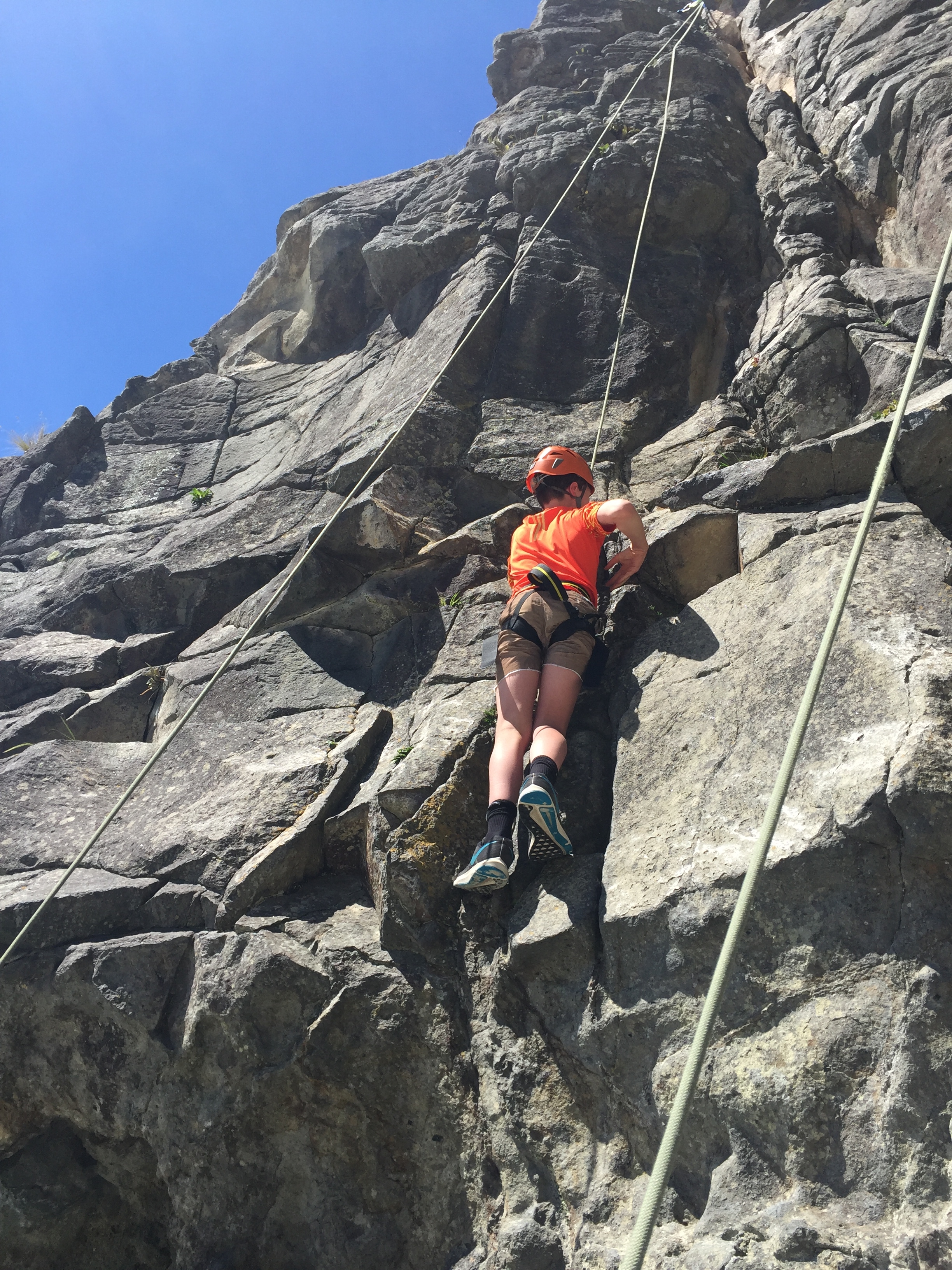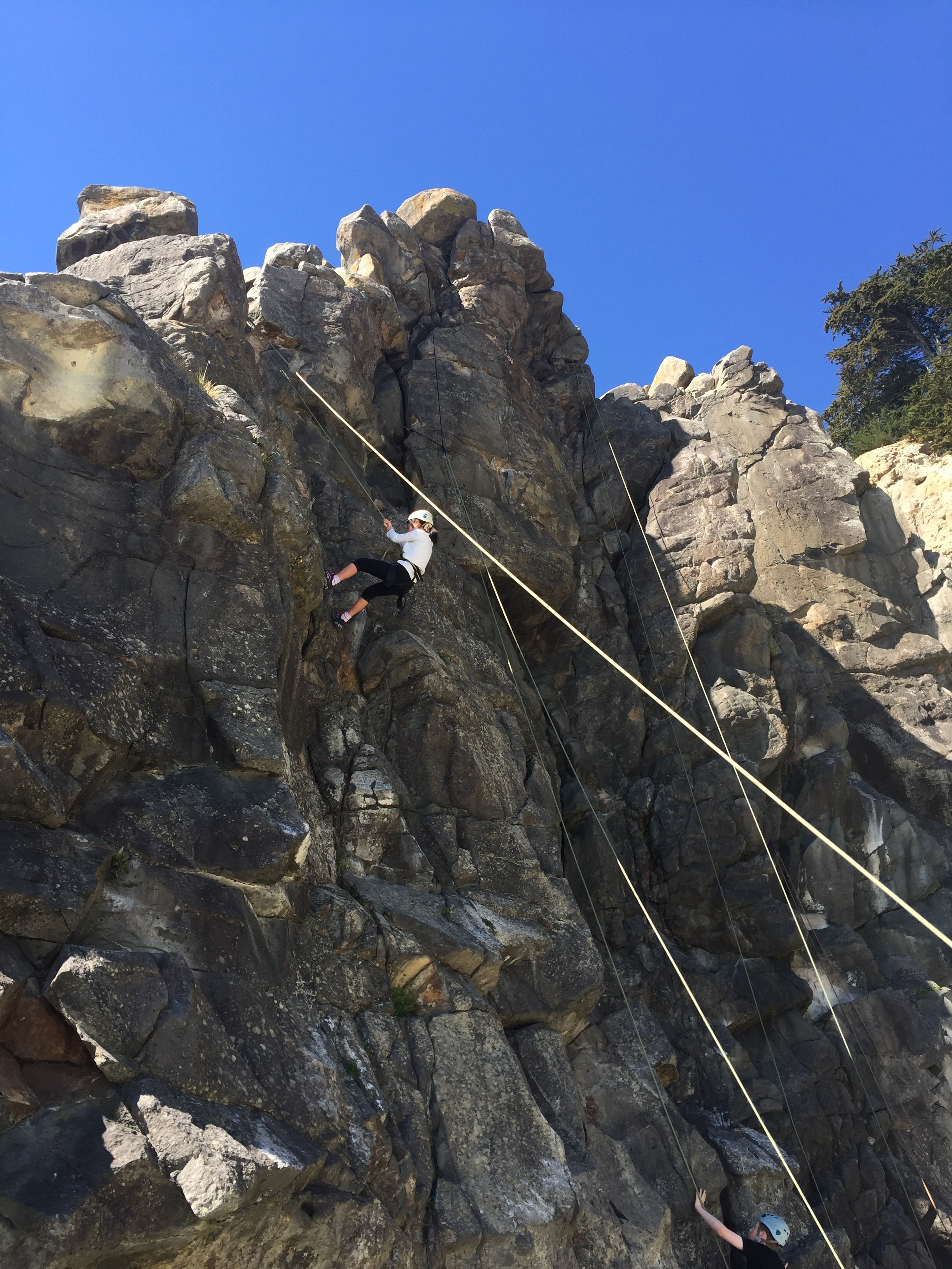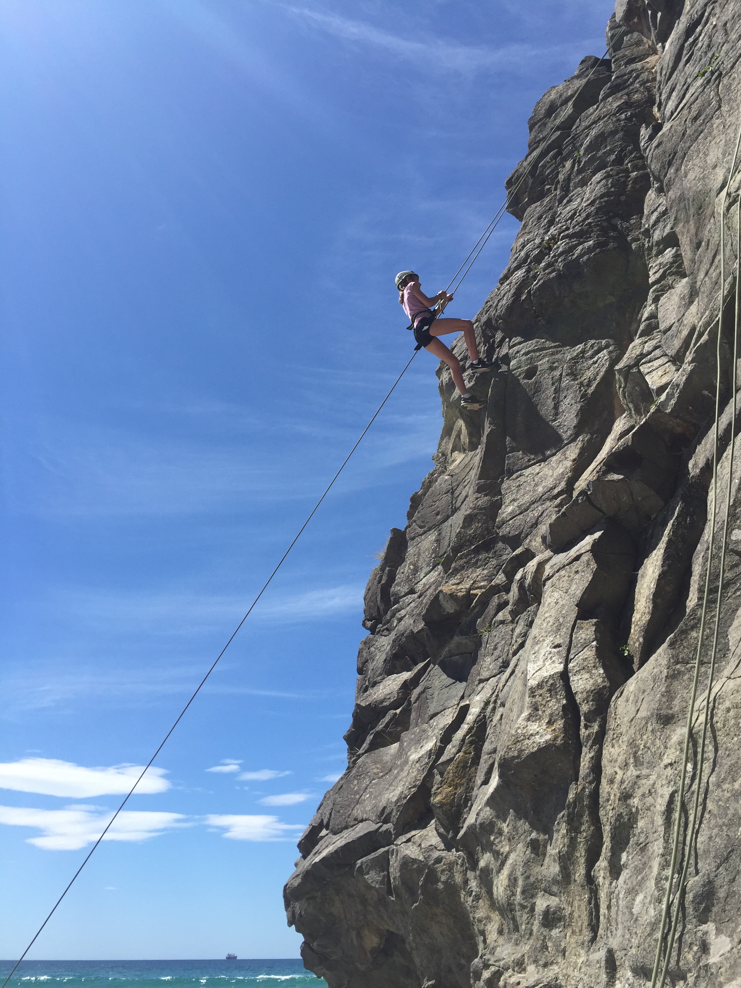 Now, for my ultimate favourite, ROCK CLIMBING!!! We walked over to the very other side of the beach and got started! We talked to the instructor, her name was Teagan and she helped us harness up. Then we went on to do a little exercise to get us warmed up and ready to climb. It was called bouldering. What we had to do for that was walk along the side of the rocks, we were only like half a meter above the ground. This was just a warmup to get our hands use to the hand holds and grips. Now for the fun part, THE CLIMBING!! We had to have a demonstrator to show everyone how it is done, and it is just a coincidence that it was yours truly, me, who was the demonstrator. I got to be the first person to climb, and boy it was fun! When I first got up into the climb, I was pretty excited and nervous. But the part that is even scarier was when you had to abseil back down. Now for the big climbs! One thing that I found on some of the climbs was that you really had to let your inner muscle free and do it thing, you also had to really get down on your knees, or should I say, up!? When I was rock climbing I felt a variety of emotions! I'm sure that the rest of the class did too!