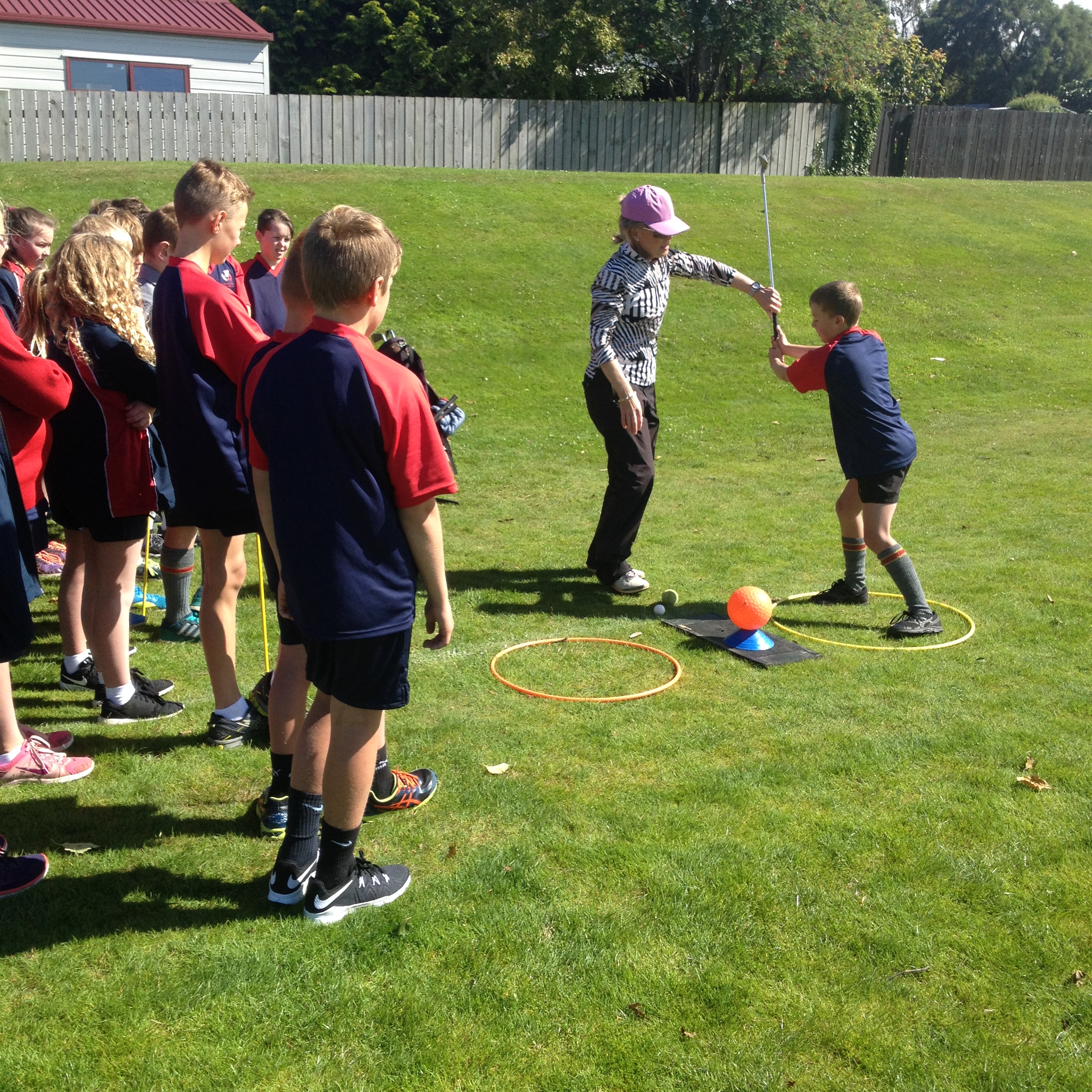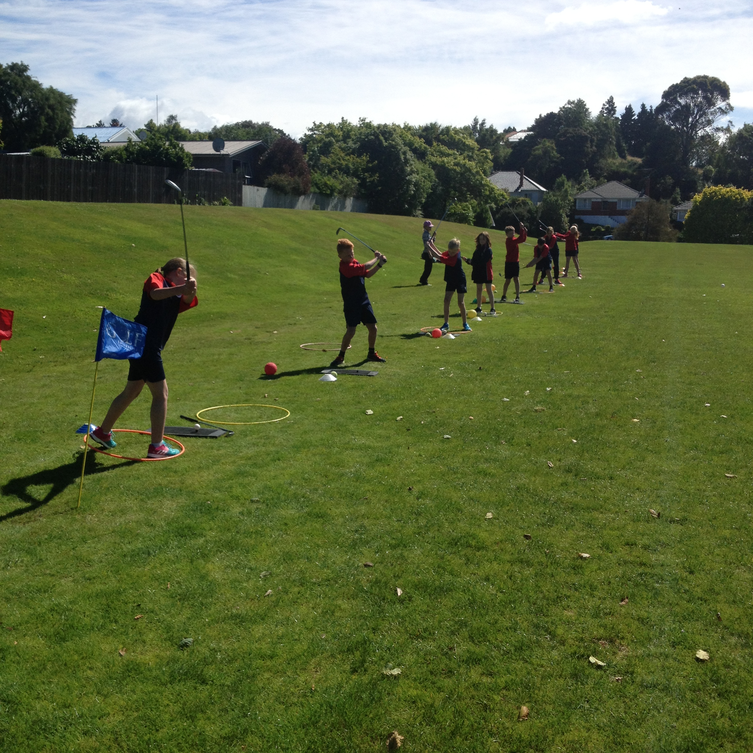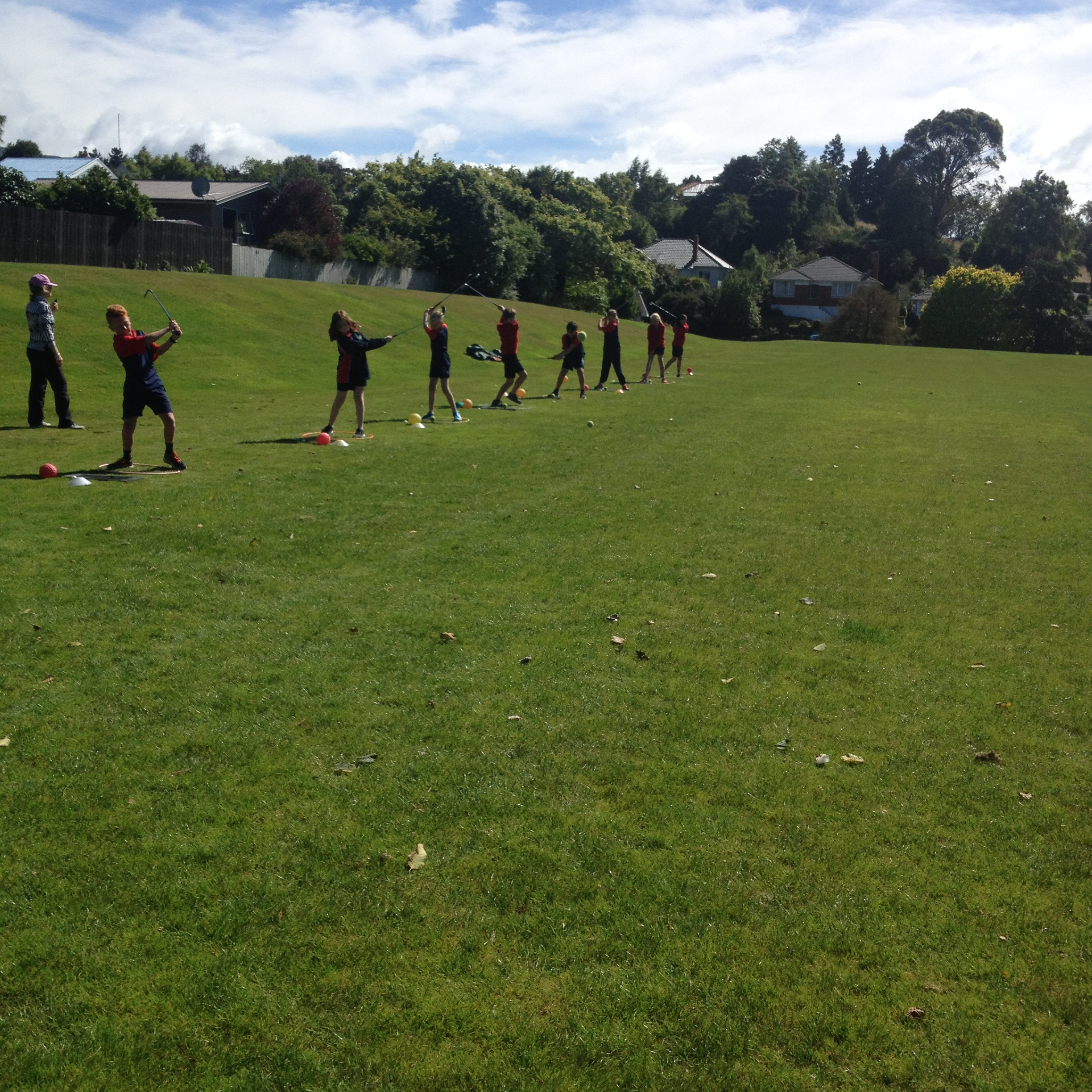 Today Room 5 had Kiwi Golf with Melanie Harper from Balmacewen Golf Club. We learnt how to hit a golf ball. We also played a game where we had to hit the ball as far as we could toward our team-mates in the distance. Then the person in front would run and get the ball and the person that hit the ball would also run to the next spot.