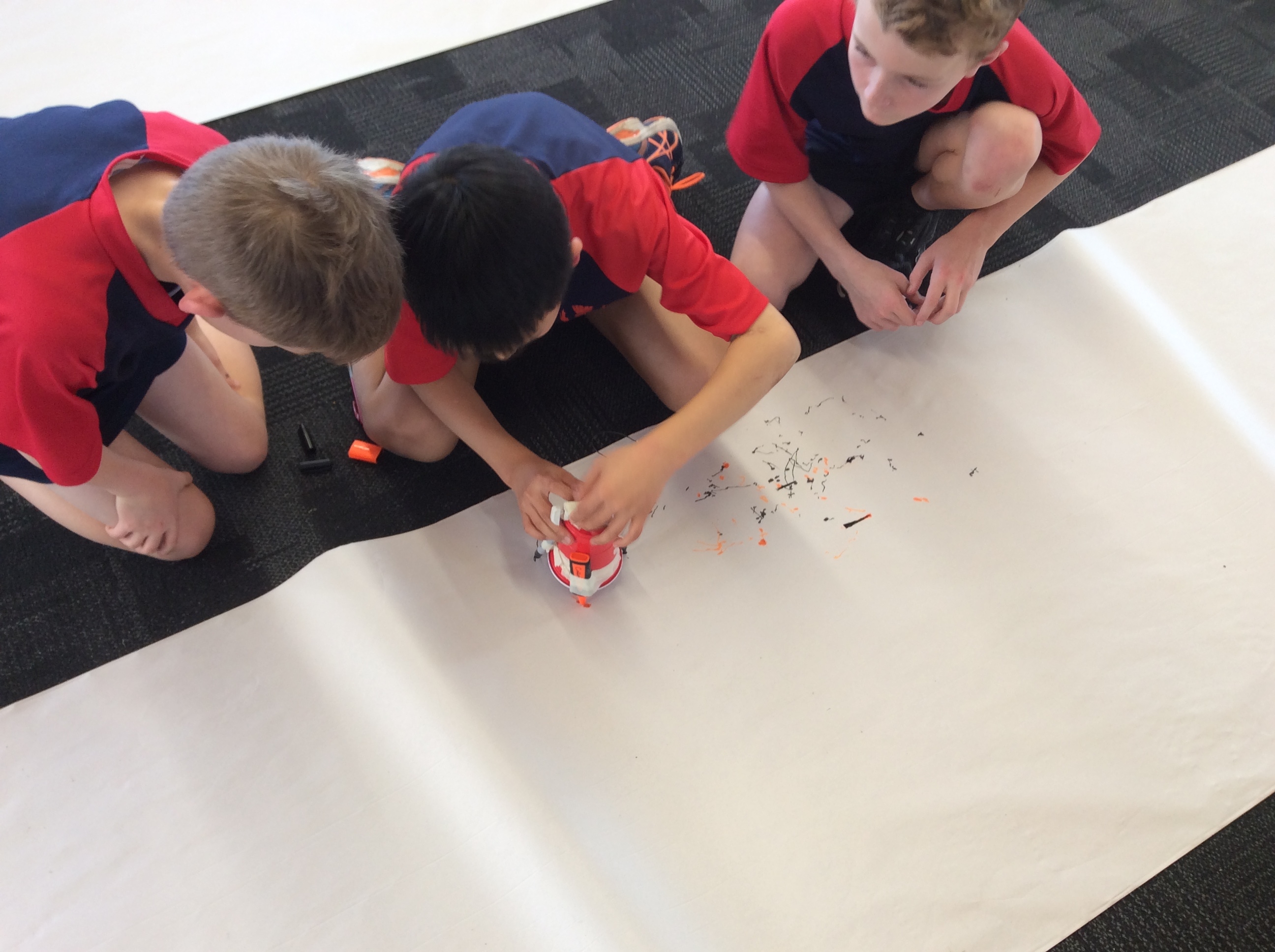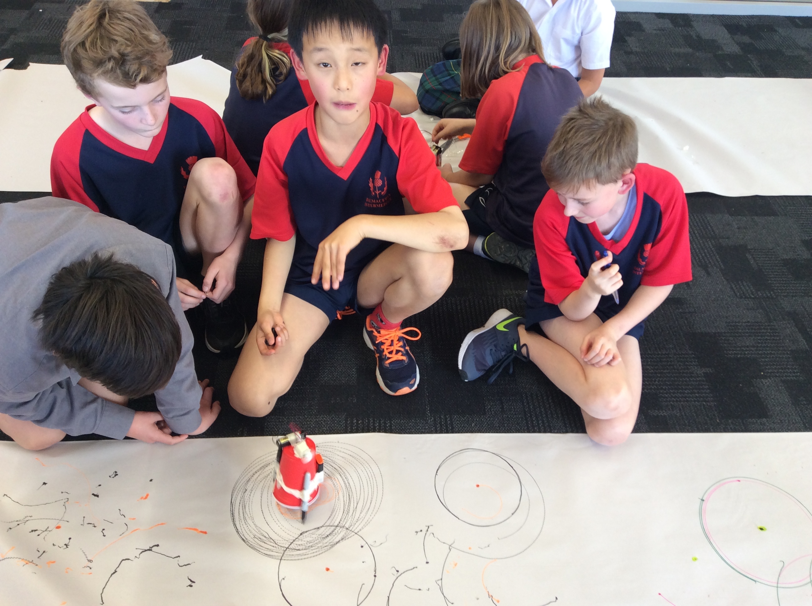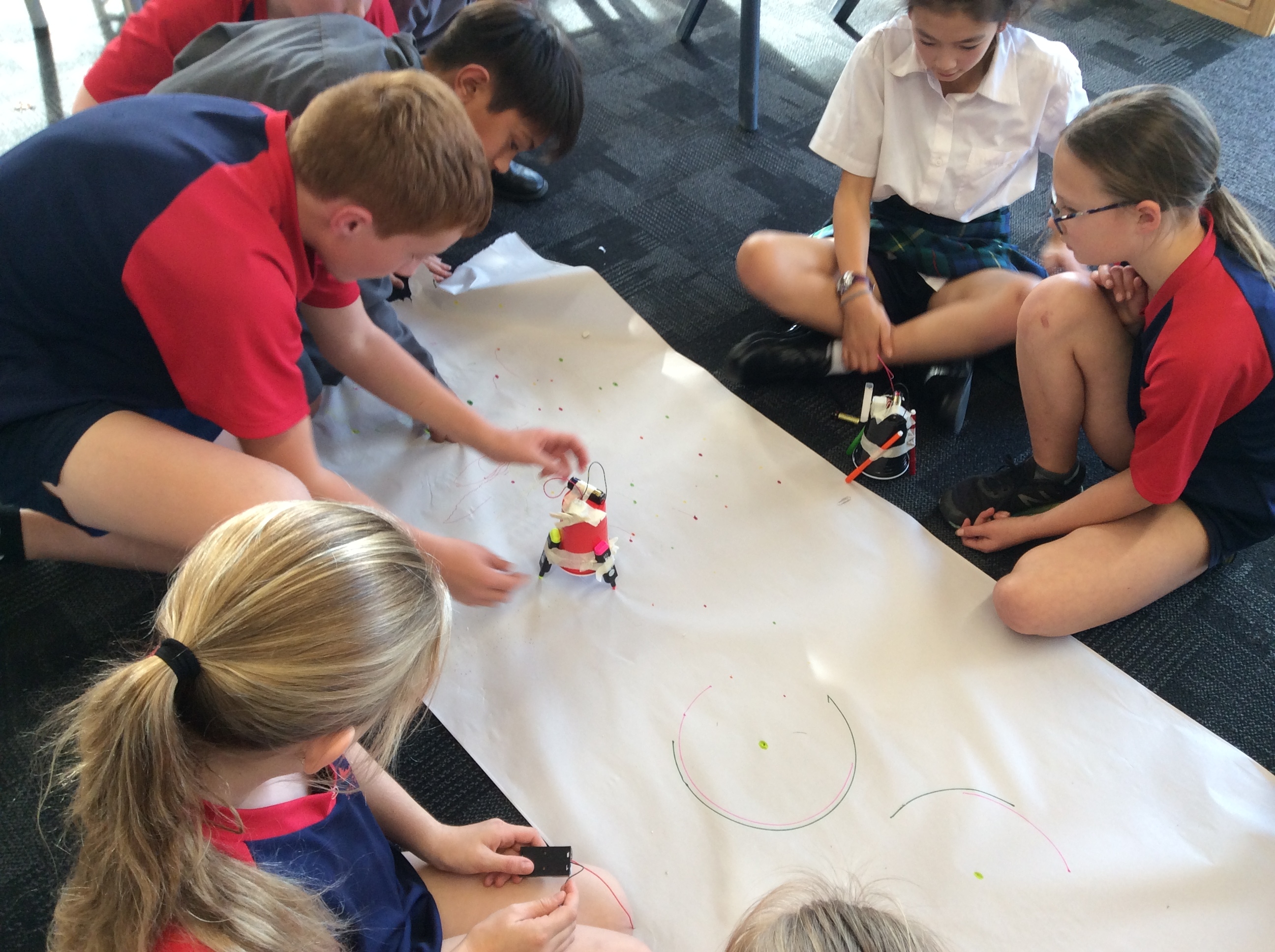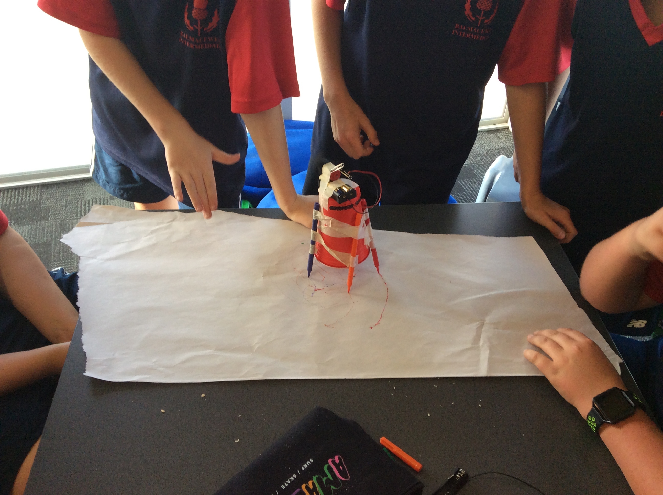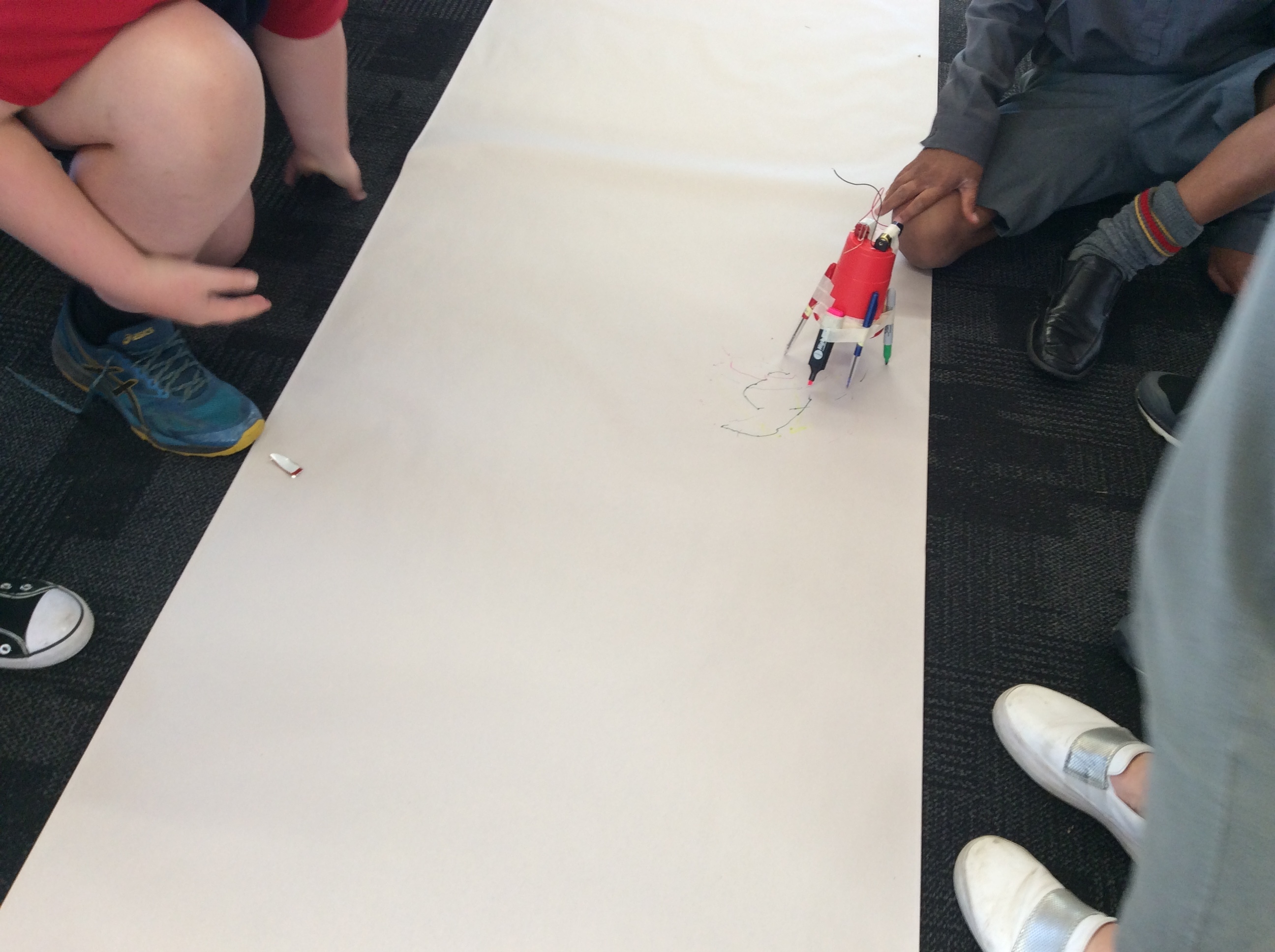Rooms 1, 2 and 11 created scribble bots! The teachers just gave us the equipment and we had to problem solve and persevere as a group to get them to work. First, we looked at circuits and switches and how they work. Then it was time to make the scribble bots, we stuck a motor with some batteries to a cup with pens/pencils sellotaped around it. We put it down on some paper and flicked the switch. Check out the photos below to see them in action. WOW, they made some cool patterns on the paper.