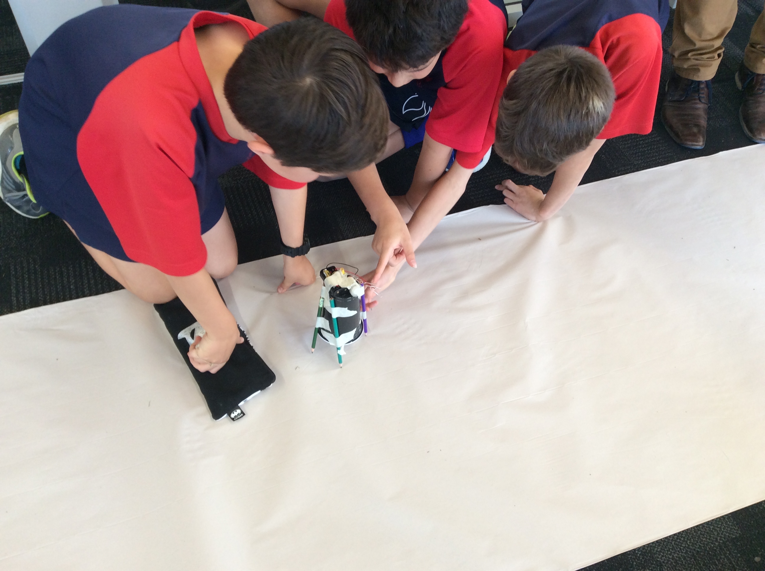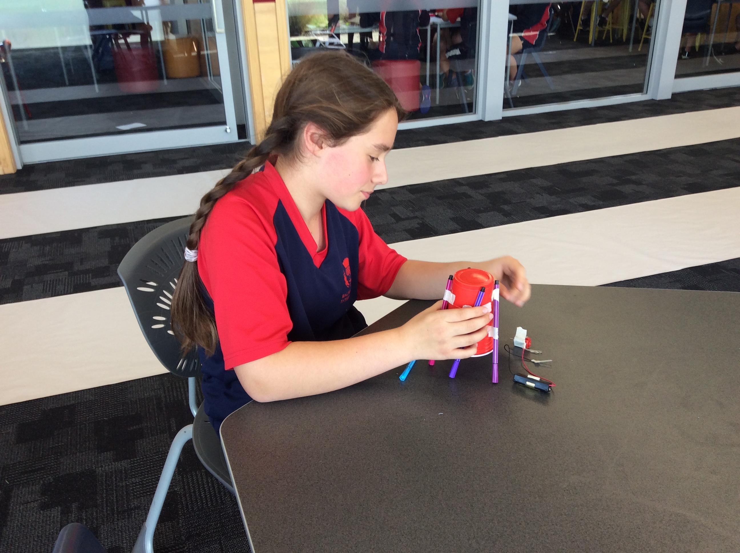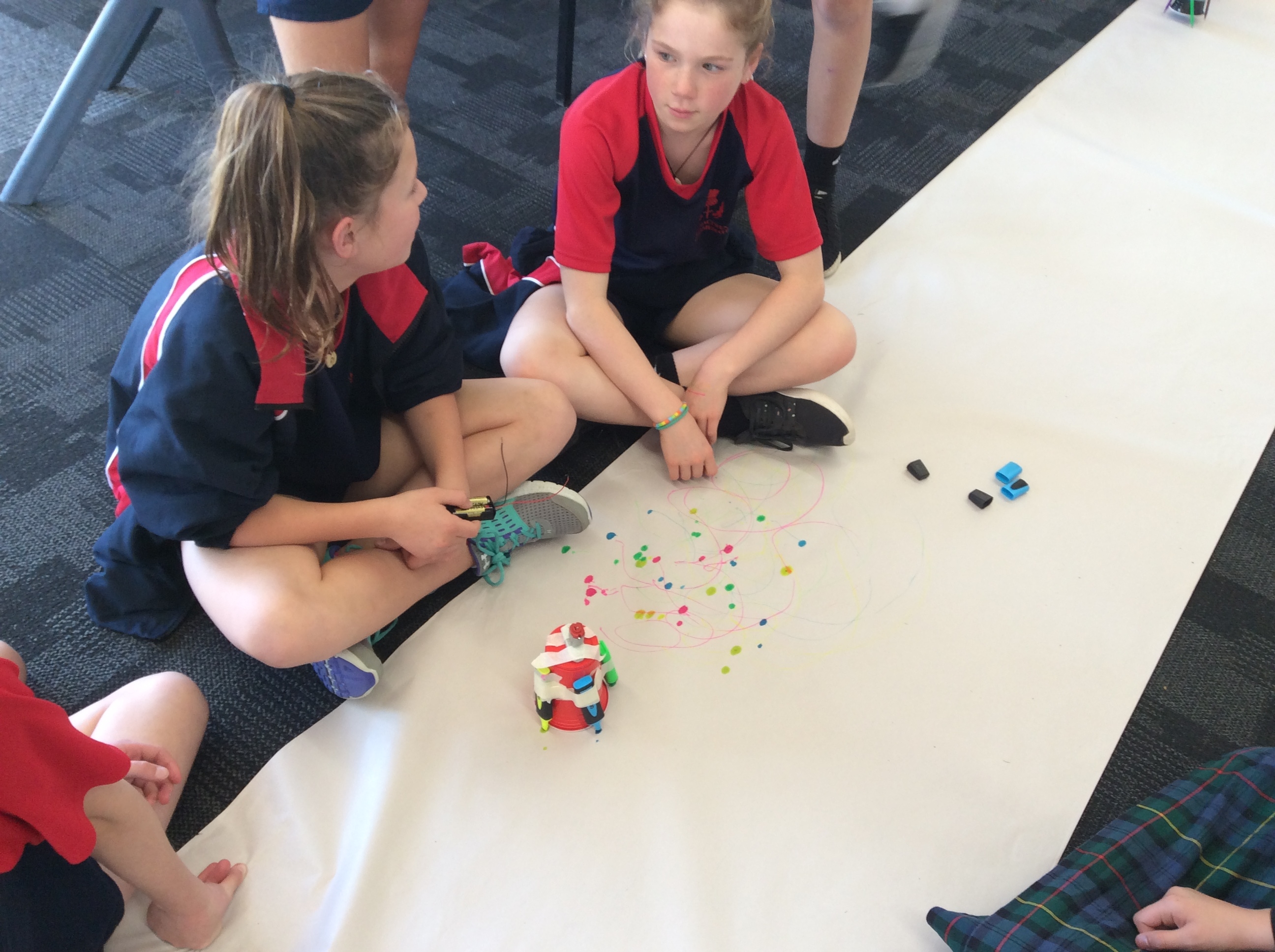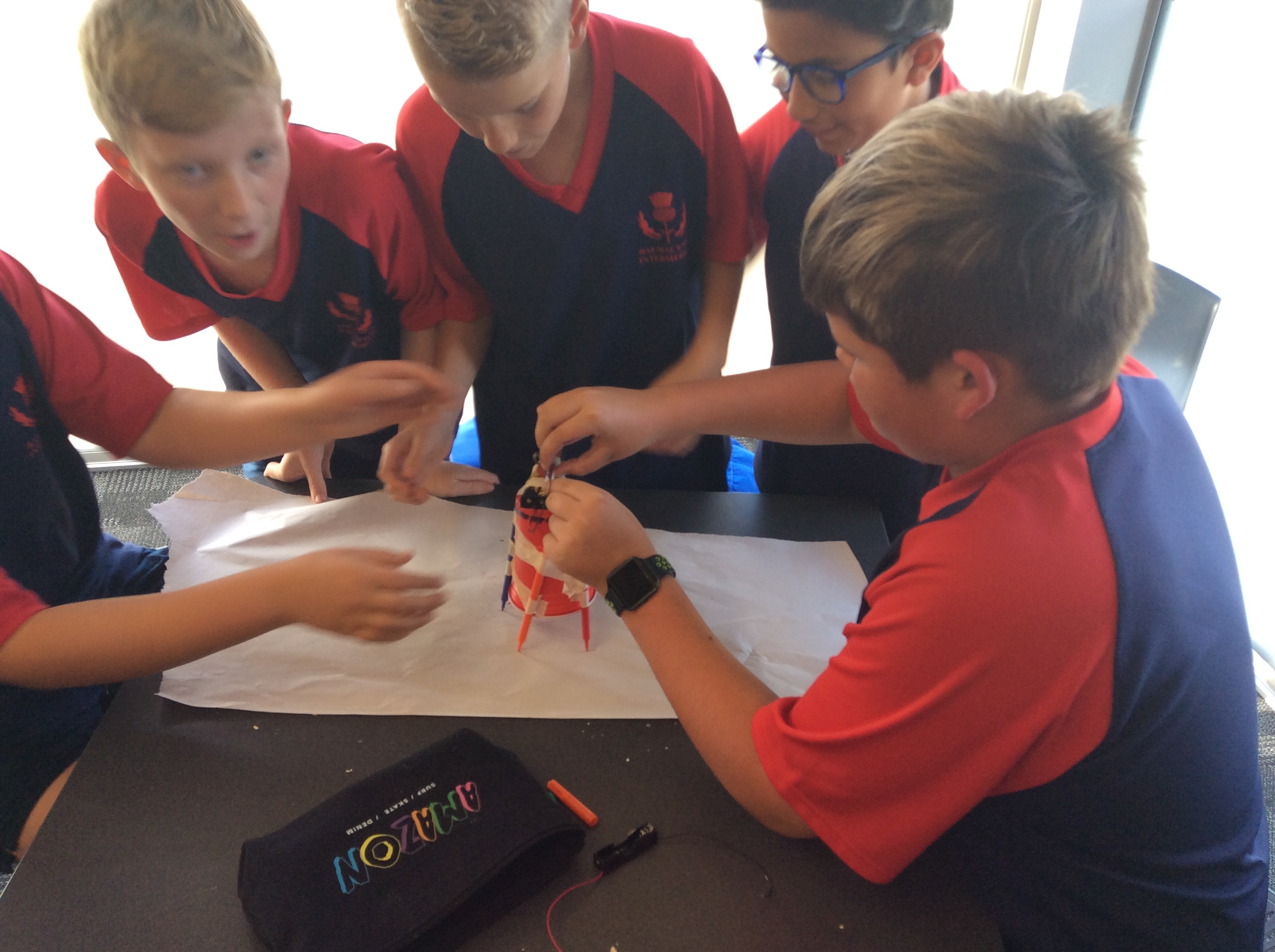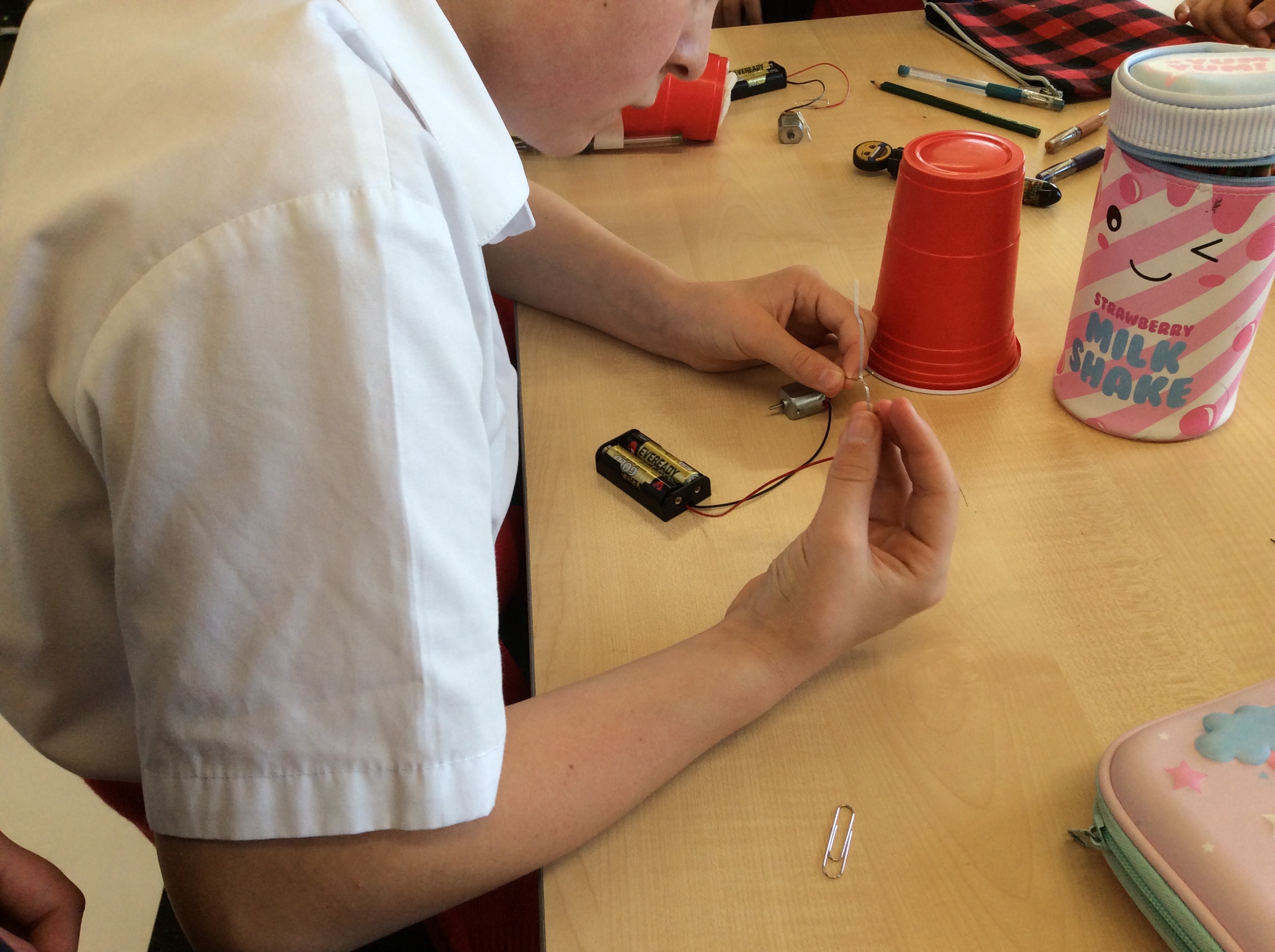 Rooms 1, 2 and 11 created scribble bots! The teachers just gave us the equipment and we had to problem solve and persevere as a group to get them to work. First, we looked at circuits and switches and how they work. Then it was time to make the scribble bots, we stuck a motor with some batteries to a cup with pens/pencils sellotaped around it. We put it down on some paper and flicked the switch. Check out the photos below to see them in action. WOW, they made some cool patterns on the paper.