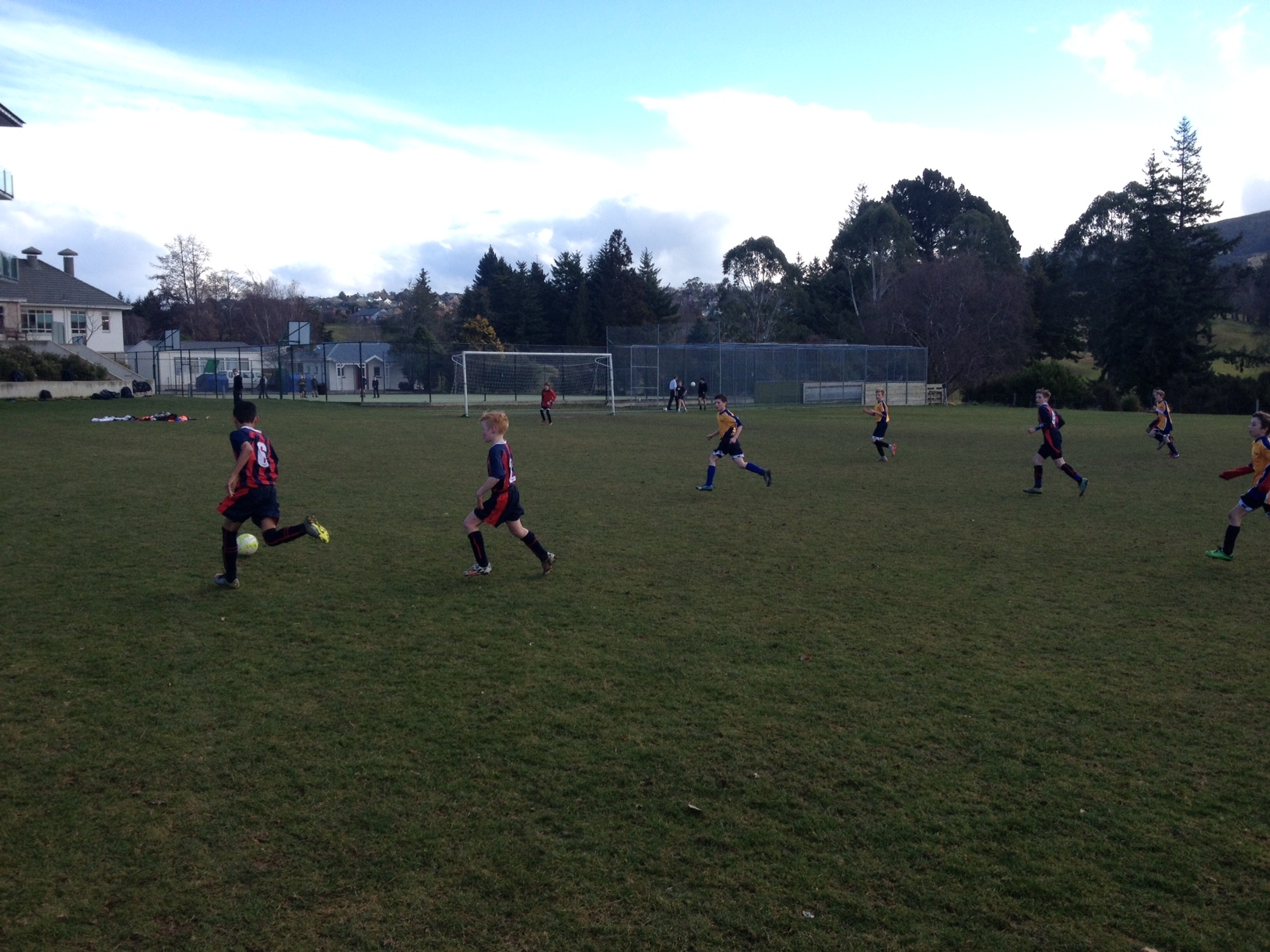 The first game of the term was against Taieri College. Although played in Mosgiel, the team looked right at home from the first whistle with Tyson grabbing his chance up front with both hands and making a run from the kick off, right into the back of the net. Tyson Room 14 would go on to put a further six goals past the busy Taieri keeper in a well played afternoon's work.