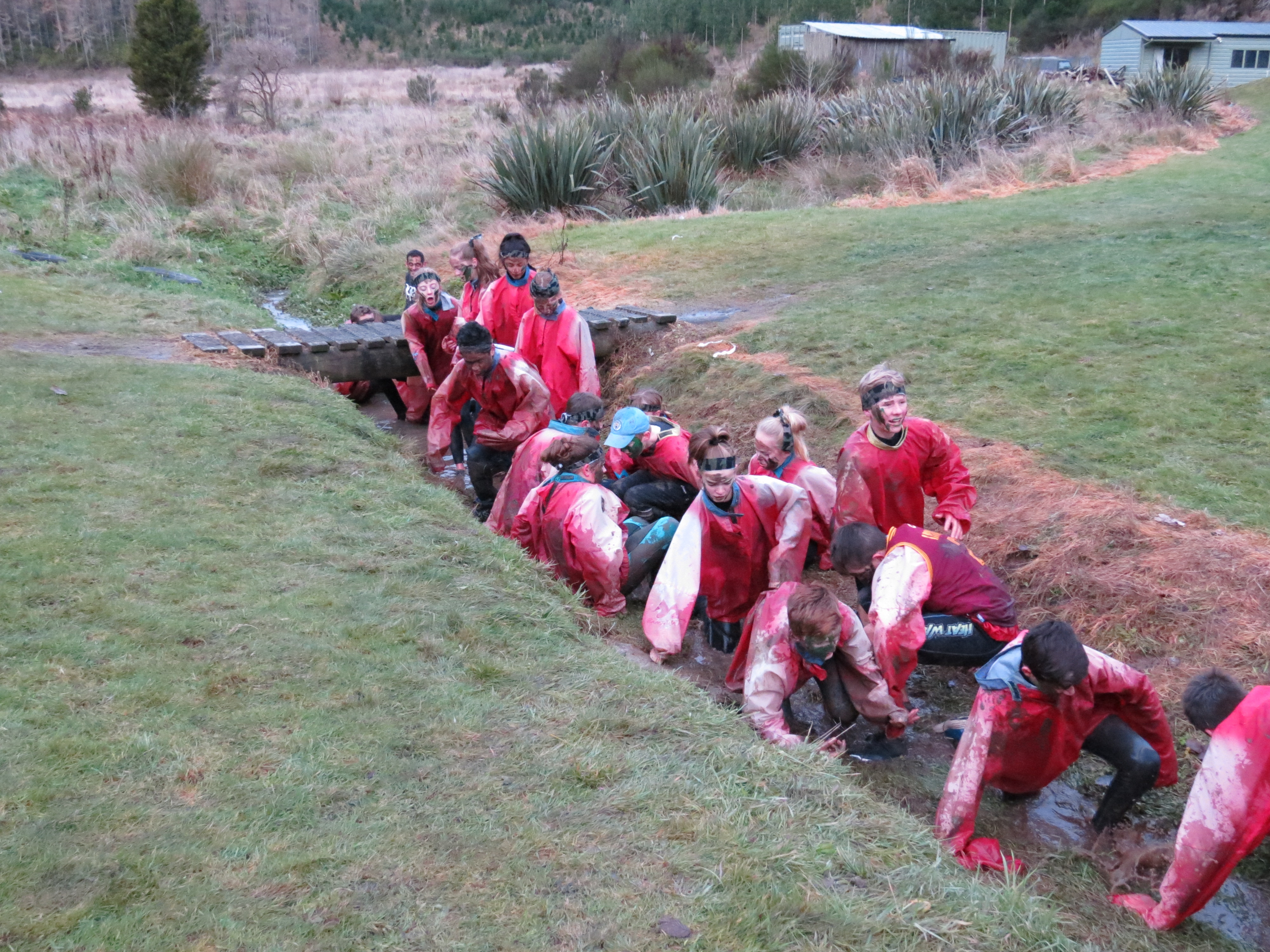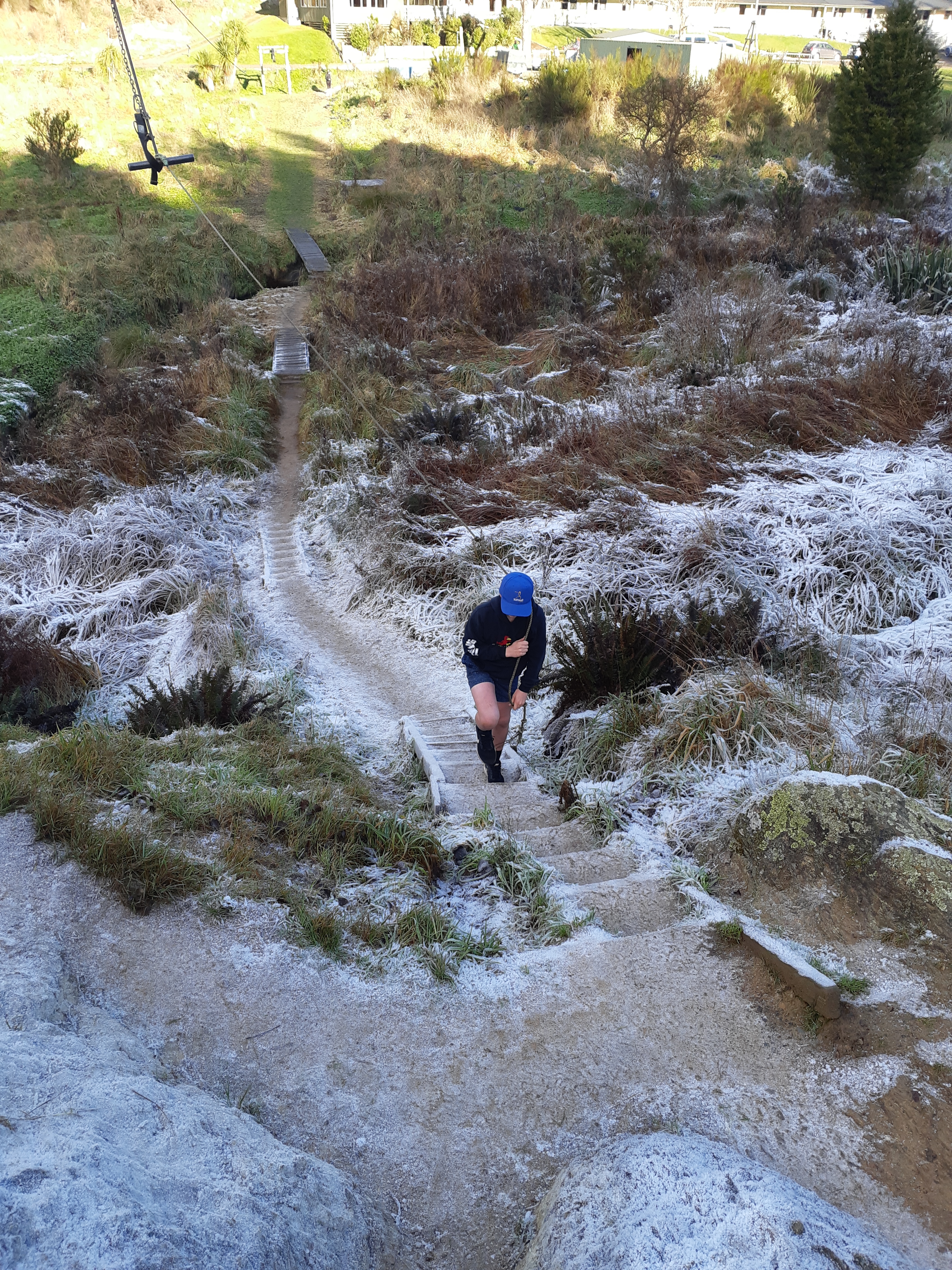 Grass collapses beneath my heavy footfalls as muddy water rises from the dirt drowning my feet and splashing my legs. I make my way to the top of the flying fox. Gazing around from the frost vantage point my eyes only see the finish. A picnic table. So close. Safe manoeuvres help me artfully make my way down the icy stairs. My clay coated shoes slipping with even the slightest thing provoking them. The bridge is next the frost crystals have turned to mush from the contestants before me.