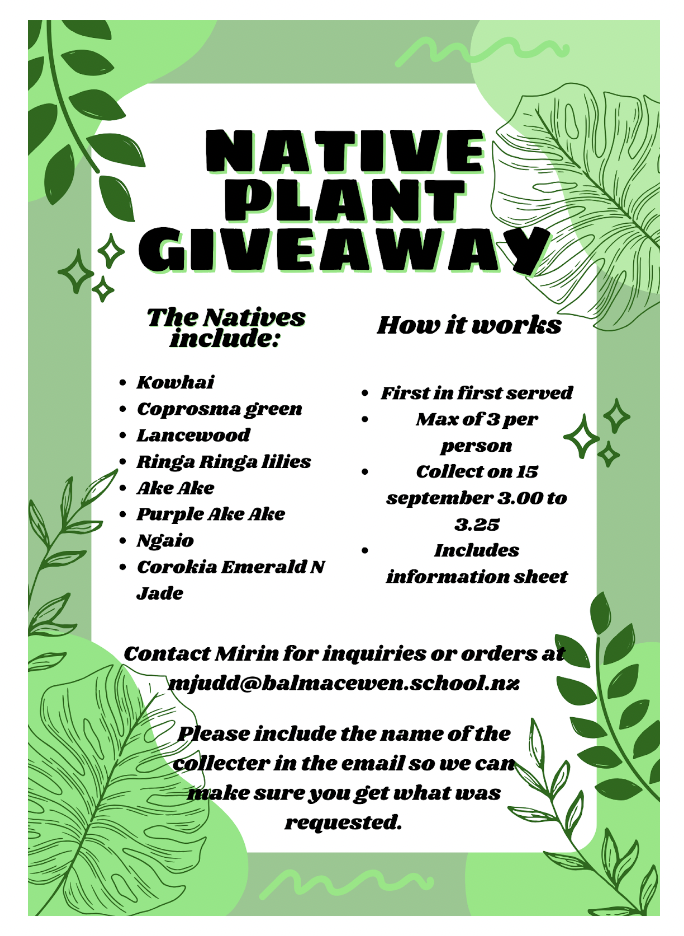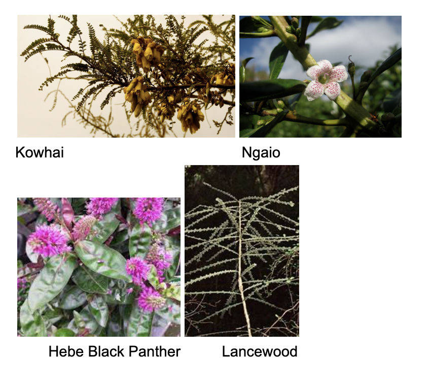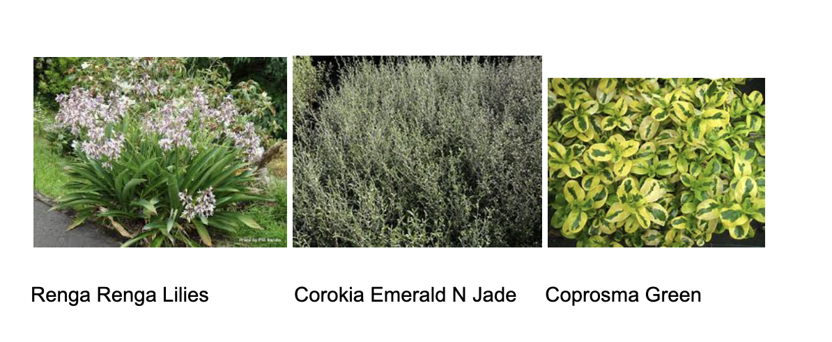 The plants available are: Kowhai, Coprosma Green,Corokia Emerald N Jade, Hebe Black Panther, Lancewood, Renga Renga Lilies, Ngaio.
