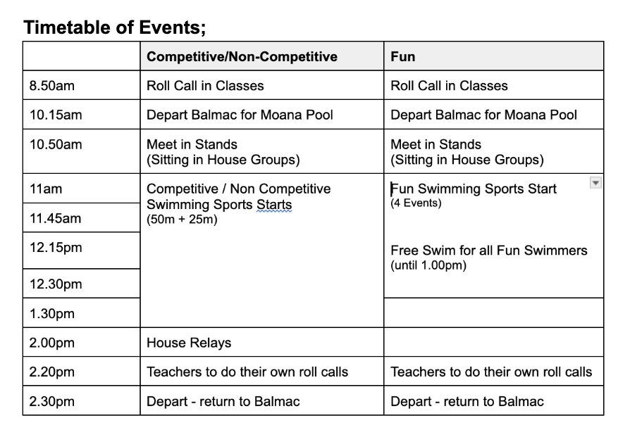After the swimming sports students can be collected from Moana Pool. Please notify your child’s teacher before the day if you will be doing this. Any students not collected from Moana Pool will walk back to Balmacewen Intermediate with teachers.