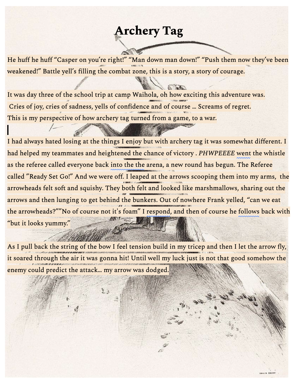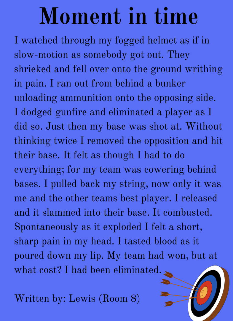 I had always hated losing at the things I enjoy but with archery tag it was somewhat different. I had helped my teammates and heightened the chance of victory . PHWPEEEE went the whistle as the referee called everyone back into the the arena, a new round has begun. The Referee called ”Ready Set Go!” And we were off. I leaped at the arrows scooping them into my arms, the arrowheads felt soft and squishy. They both felt and looked like marshmallows, sharing out the arrows and then lunging to get behind the bunkers. Out of nowhere Frank yelled, “can we eat the arrowheads?””No of course not it's foam” I respond, and then of course he follows back with “but it looks yummy.”