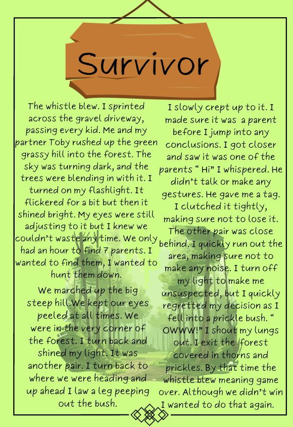 They were so close to us now that it was actually getting scary. The suspense was slowly building up on me, ready to explode. The light got brighter and then: a tiny voice whispered “Found you” as disappointment filled the atmosphere around me. We crawled out of our hiding place, stumbling around in the dark. We ended up getting 4th out of everyone. We were so close, yet so far. Emerson