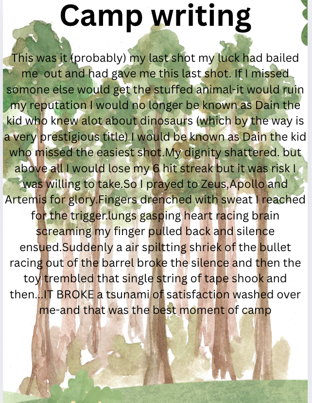 This was it (probably) my last shot my luck had bailed me out and had gave me this last shot. If I missed somone else would get the stuffed animal-it would ruin my reputation I would no longer be known as Dain the kid who knew alot about dinosaurs (which by the way is a very prestigious title) I would be known as Dain the kid who missed the easiest shot, my dignity shattered. But above all, I would lose my 6 hit streak, but it was risk I was willing to take. So I prayed to Zeus, Apollo and Artemis for glory. Fingers drenched with sweat I reached for the trigger. Lungs gasping, heart racing, brain screaming my finger pulled back and silence ensued. Suddenly an air splitting shriek of the bullet racing out of the barrel broke the silence and then the toy trembled that single string of tape shook and then...IT BROKE a tsunami of satisfaction washed over me-and that was the best moment of camp. Dain
